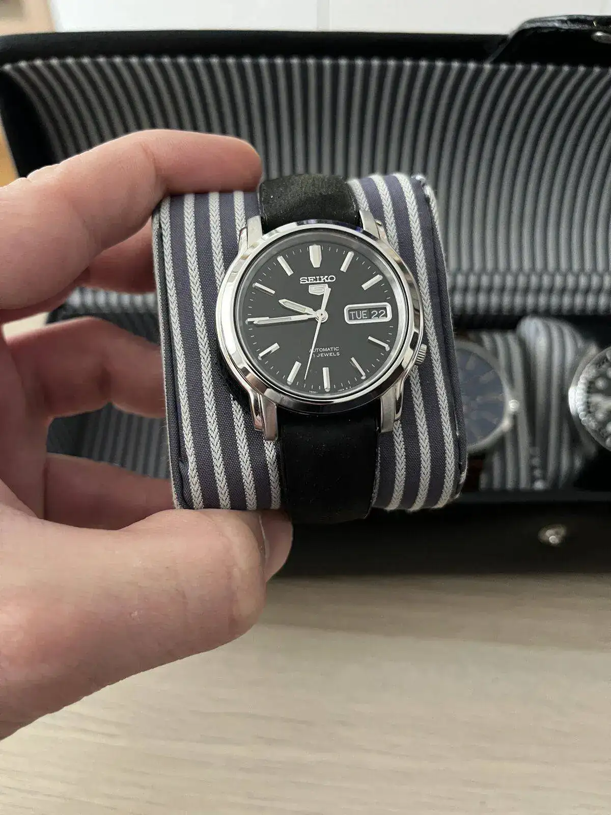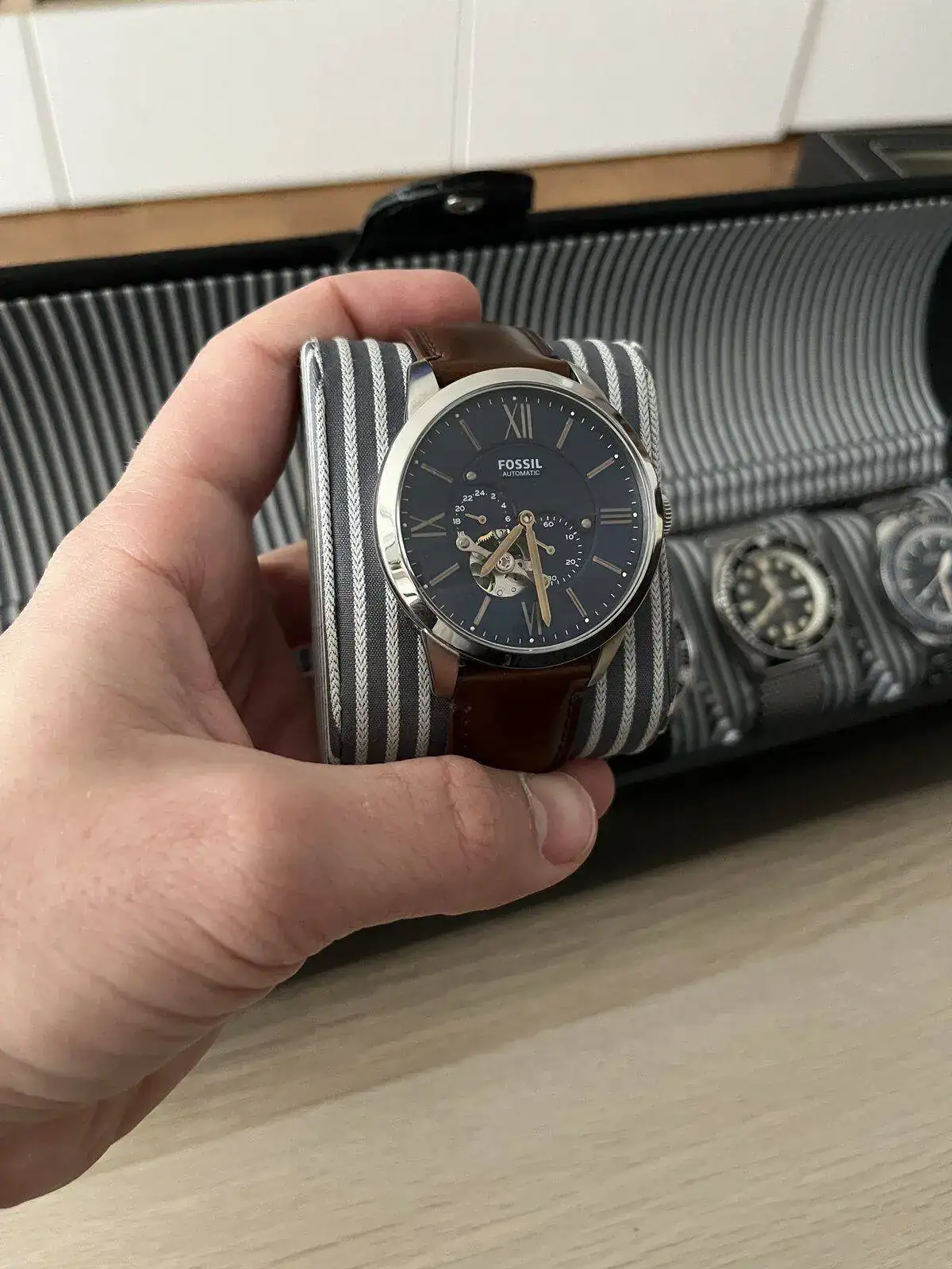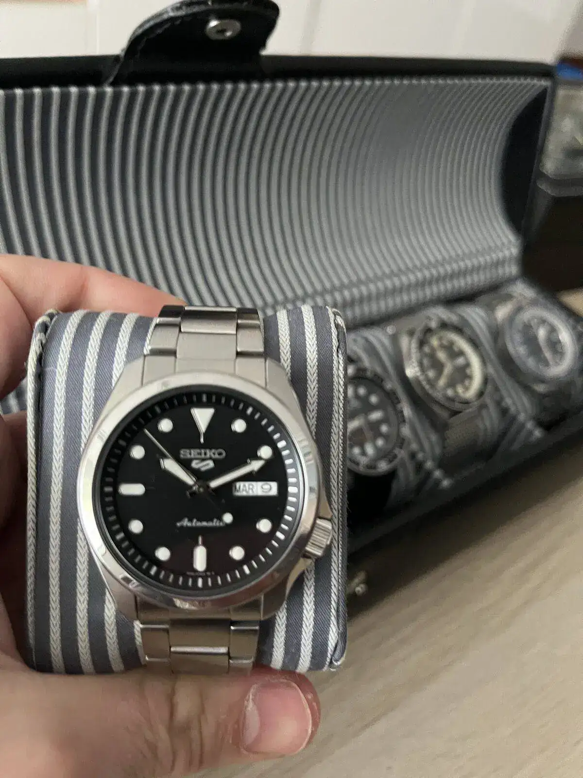 En la segunda caja, los que están en la rotación actual, tengo un FOSSIL automático open heart que uso principalmente en bodas y otros eventos de este tipo. Un discreto SEIKO 5 para las ocasiones en las que es necesario vestir un reloj más formal. Un SEIKO 5 SRPE de los nuevos sin bisel que uso para el día a día y que cumple muy bien como reloj para todo.