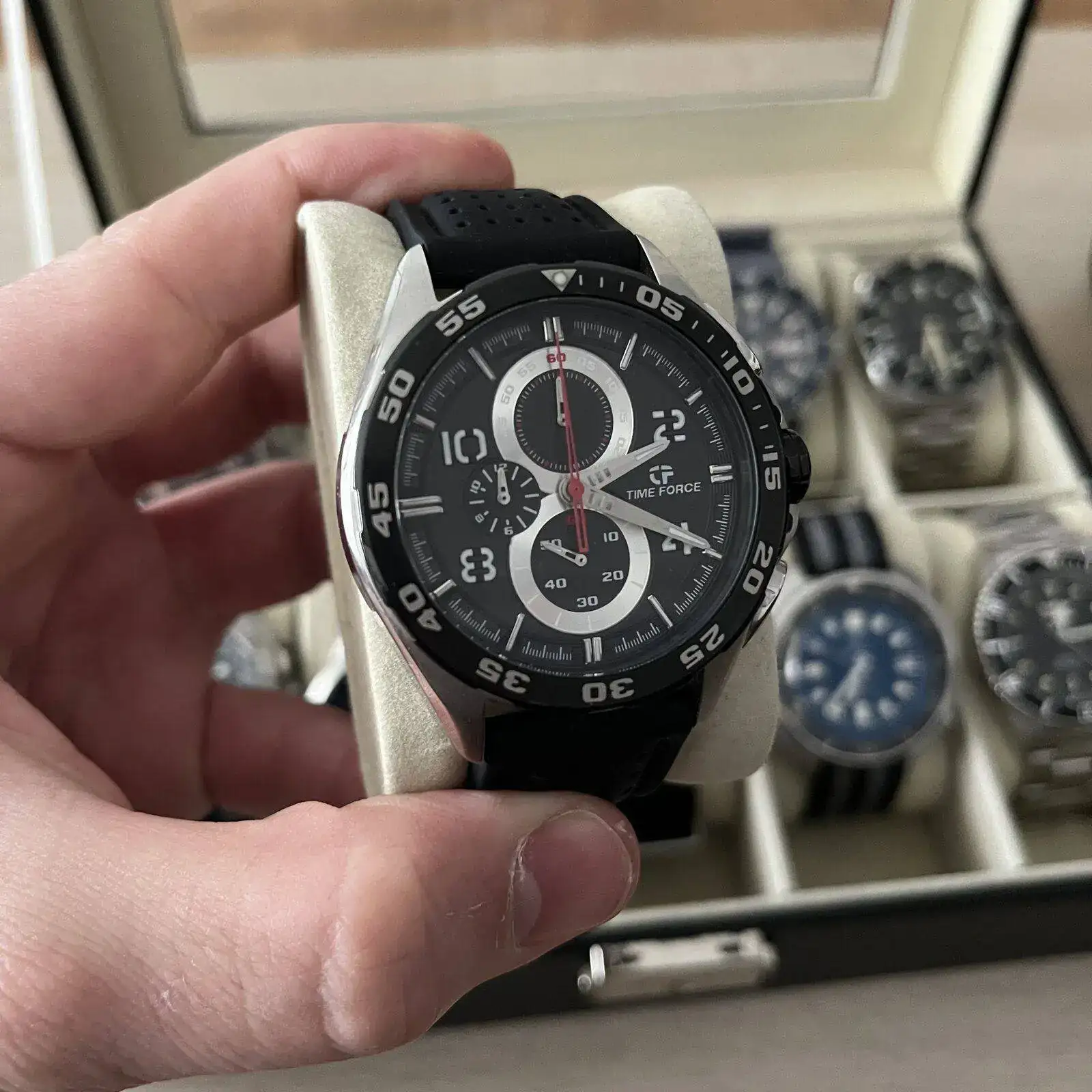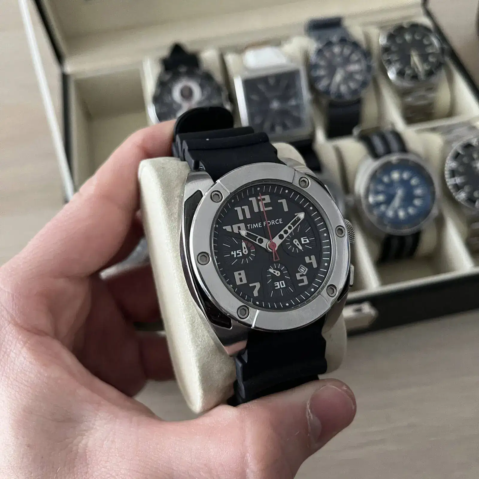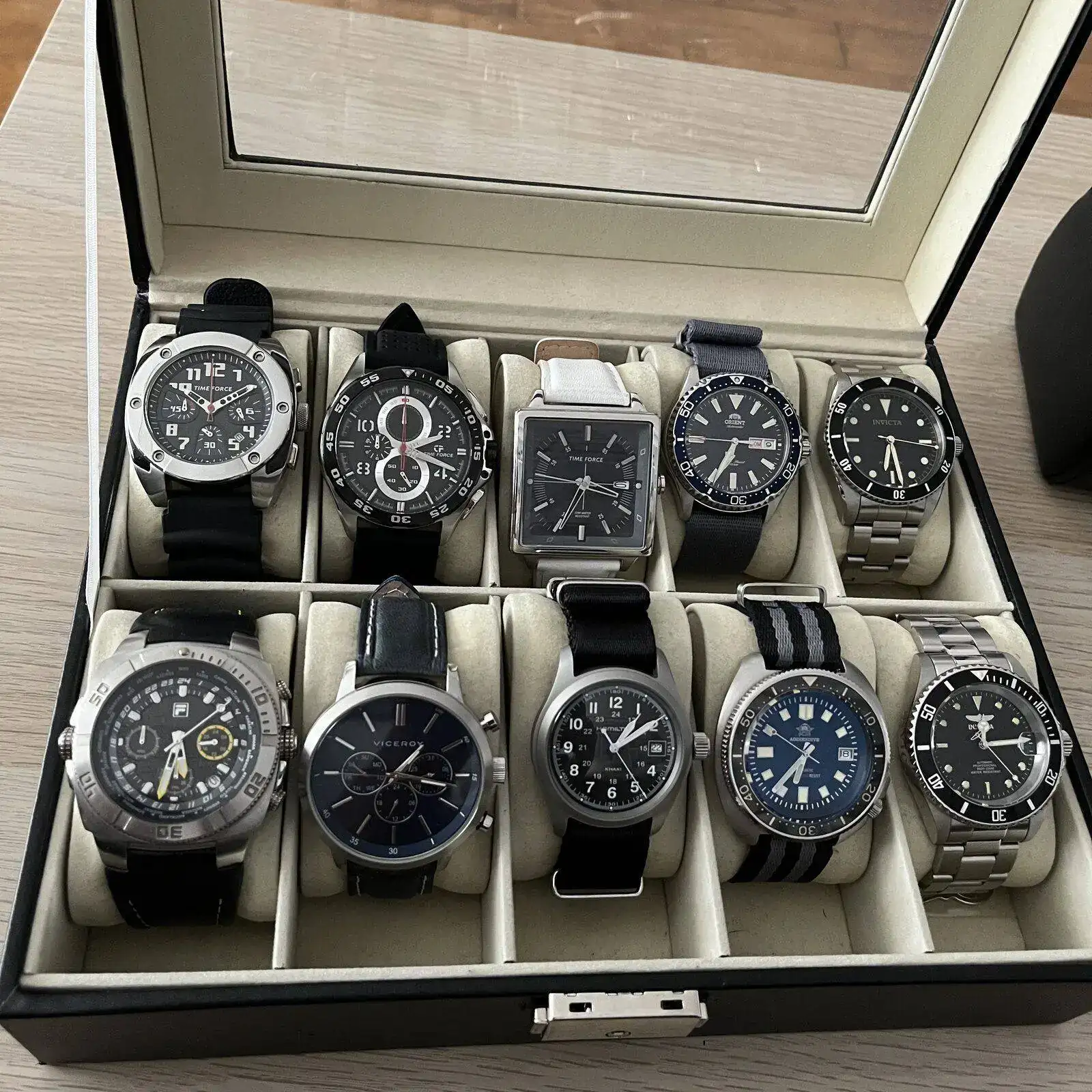 En la caja grande están las piezas que ahora mismo menos uso. No quiere decir que no los use pero que por las circunstancias que sean estan fuera de la rotación en este momento. En esta caja hay 6 cuarzos, todos de un tamaño grandote y tres de ellos de la marca TIME FORCE. Luego hay otro cronógrafo de la marca FILA, un VICEROY con una esfera azul preciosa y un calendario con una estética de cronógrafo y un HAMILTON KHAKI de cuarzo. Completan la caja 4 automáticos. Un ORIENT KAMASU, un ADDIESDIVE chinito con NH35 y bisel cerámico estilo capitan willard, un INVICTA PRODIVER 8926 y otro INVICTA 1953 con bisel negro.