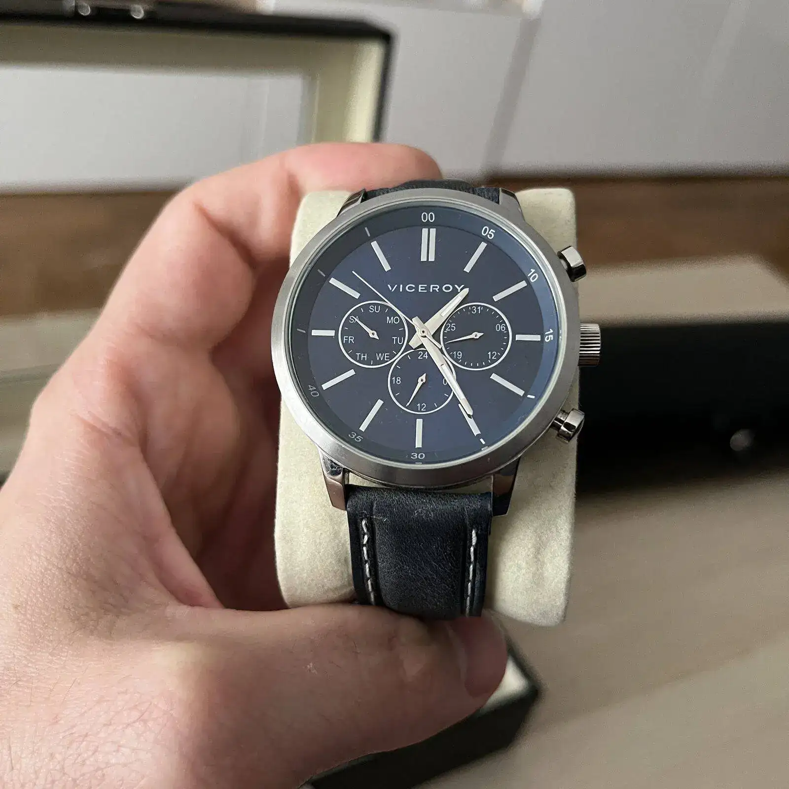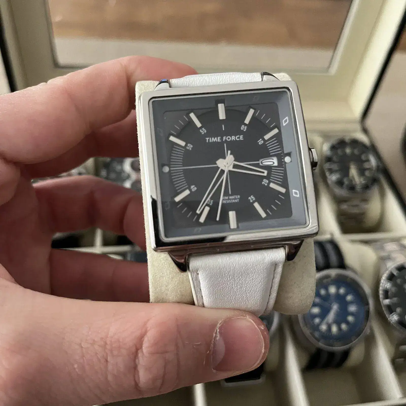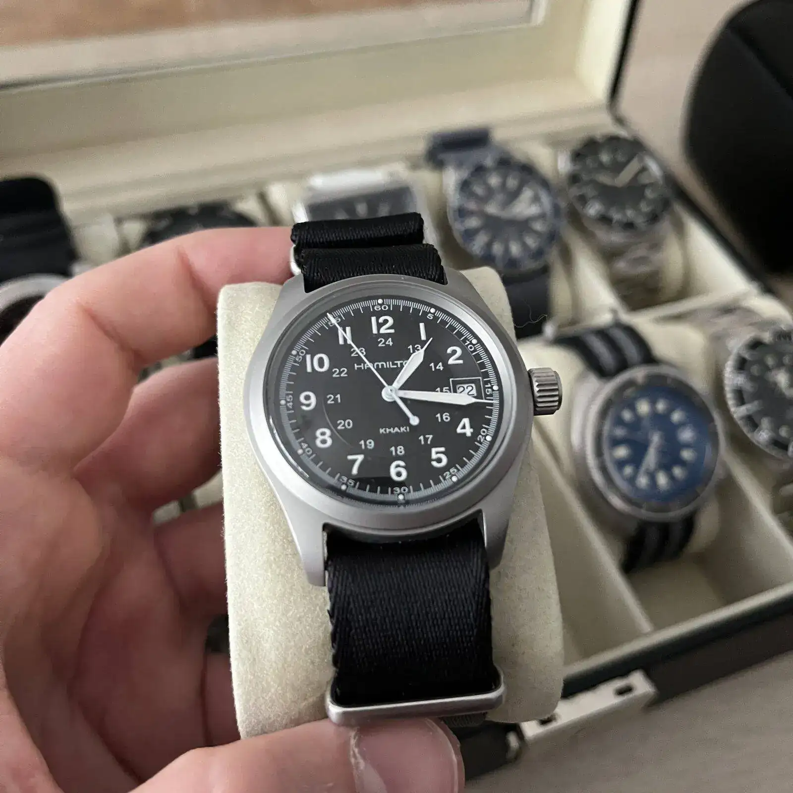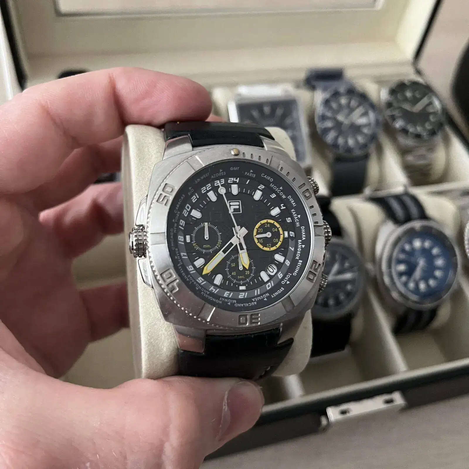En la caja grande están las piezas que ahora mismo menos uso. No quiere decir que no los use pero que por las circunstancias que sean estan fuera de la rotación en este momento. En esta caja hay 6 cuarzos, todos de un tamaño grandote y tres de ellos de la marca TIME FORCE. Luego hay otro cronógrafo de la marca FILA, un VICEROY con una esfera azul preciosa y un calendario con una estética de cronógrafo y un HAMILTON KHAKI de cuarzo. Completan la caja 4 automáticos. Un ORIENT KAMASU, un ADDIESDIVE chinito con NH35 y bisel cerámico estilo capitan willard, un INVICTA PRODIVER 8926 y otro INVICTA 1953 con bisel negro.