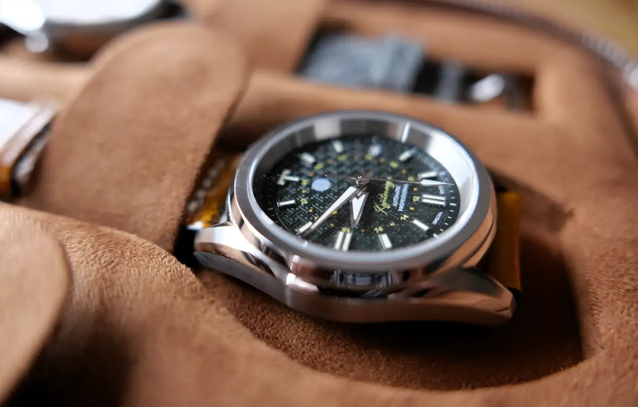 Una de mis primeras incursiones en movimientos GMT. Justo en la foto no se ve pero hay una aguja GMT amarilla debajo de la minutera. La calidad de las esferas de Komo es muy alta. La correa de piel pintada a mano de color camel combina perfectamente con la esfera verde oscuro. La correa es de Lorente Straps. Muy cómoda.