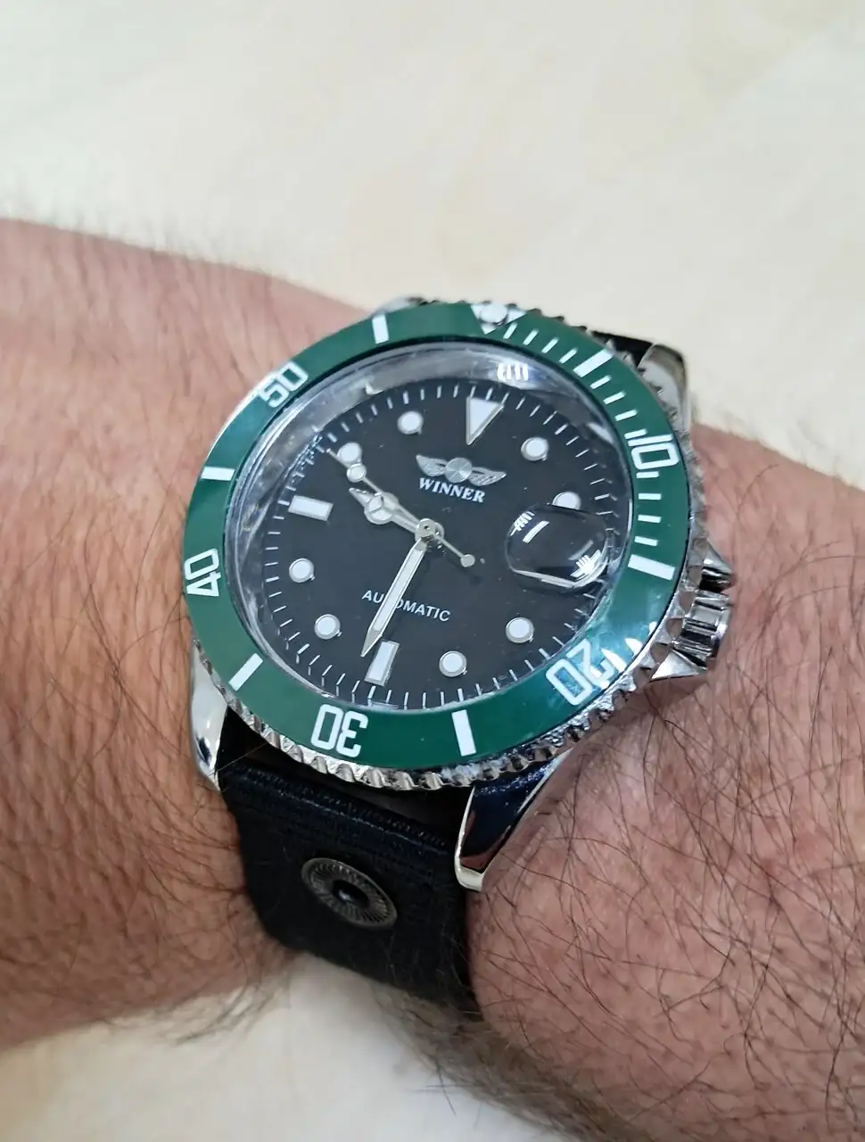 Un Winner muy baratito al que le he cambiado el insert bisel que traía en negro por este verde y también le he puesto un cristal de zafiro. Movimiento automático.
