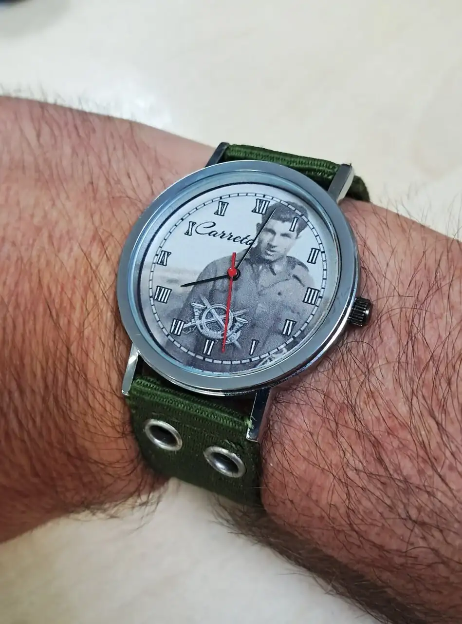 Este no tiene marca en concreto. Sí lleva un mecanismo de cuarzo Miyota. Lo encargué en una web donde lo personalizas a tu gusto y puse una foto de mi Abuelo de cuando estaba en plena Guerra Civil.