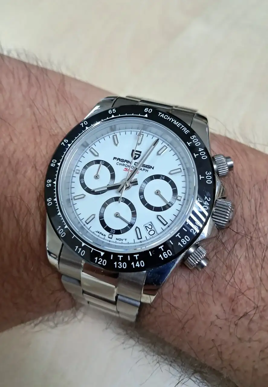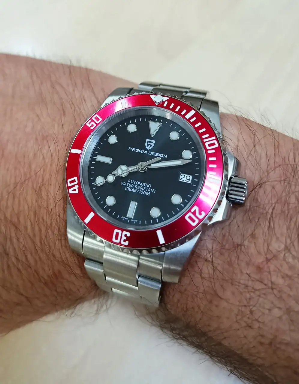 Un Pagani con el archiconocido movimiento NH35 al que le cambié el insert bisel por el que veis en rojo. También le quité la lupa.