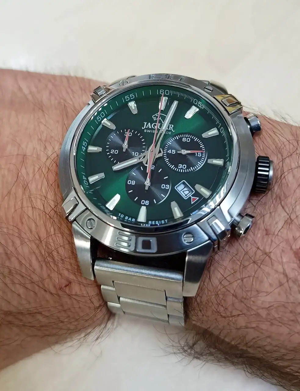 Un Jaguar regalo de mi tía querida de la que soy su sobrino consentido. Las fotos no le hacen justicia. La esfera tiene un verde precioso. Venía con correa de caucho pero le puse una de acero que me gusta más.