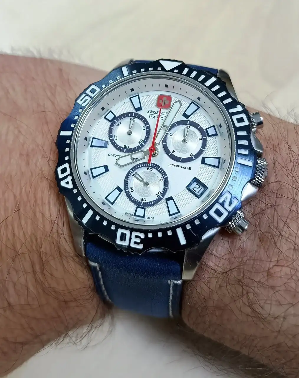 Un Swiss Military, también regalo de mi santa. Me encanta y tiene una precisión alucinante. Venía con correa de caucho azul pero le puse la que veis en piel que le queda de p.m.