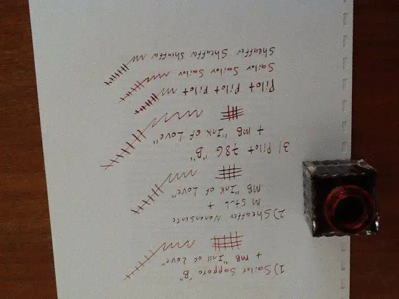 Son las plumas que tenía a la mano, no las elegí por ninguna razón particular. El resultado es que, si no supiera que es la misma tinta, podría pensar que son tres diferentes. La Pilot es un rojo encendido, intenso; la Sailor es rojo atenuado, casi naranja, y la Sheaffer es casi marrón. Unas malas fotos de ipad para que os deis una idea, perdón pero no tengo cámara ahora mismo.