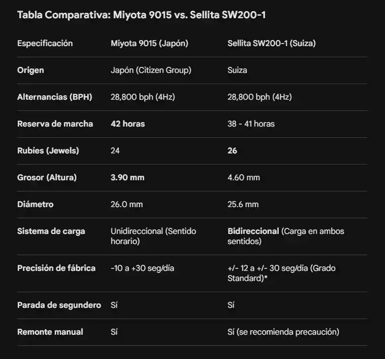 La historia es que entre éstos dos últimos, no parecen haber muchas diferencias entre los dos a nivel de especificaciones, o al menos yo no he sido capaz de encontrar nada de peso. La única diferencia real es que en el caso de la casa suiza la espiral es de "Nivaflex" y en el caso de la japonesa no he encontrado ninguna marca comercial para ese material, pero me sospecho que en el uso habitual no debería haber grandes diferencias... ¿o sí?
