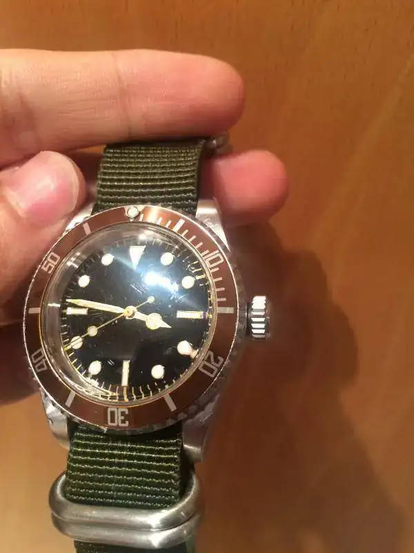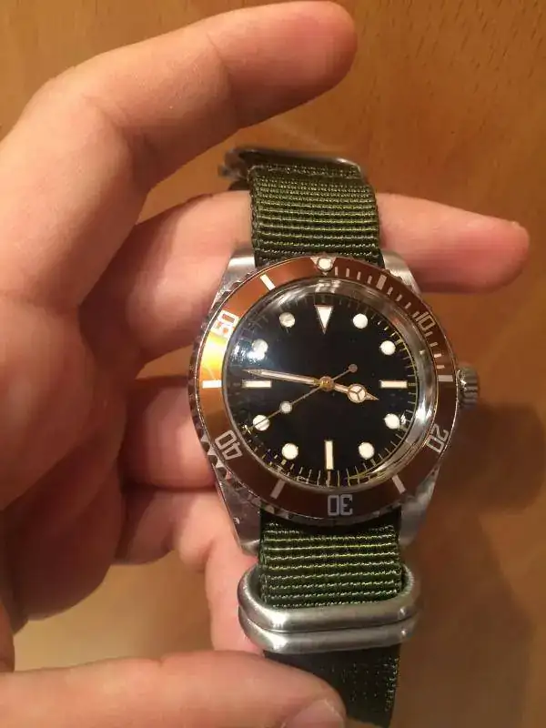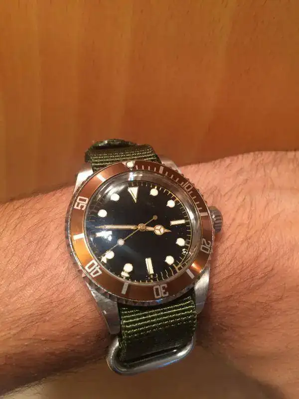 Pongo a la venta este precioso mod de diver vintage, con claras reminiscencias a algún reloj mítico, pero con la particularidad de tener un bisel marrón que a mi juicio queda muy bien con los índices y las agujas doradas. Su combinación con el plexi abultado es impresionante.