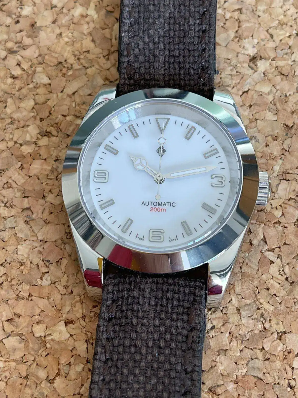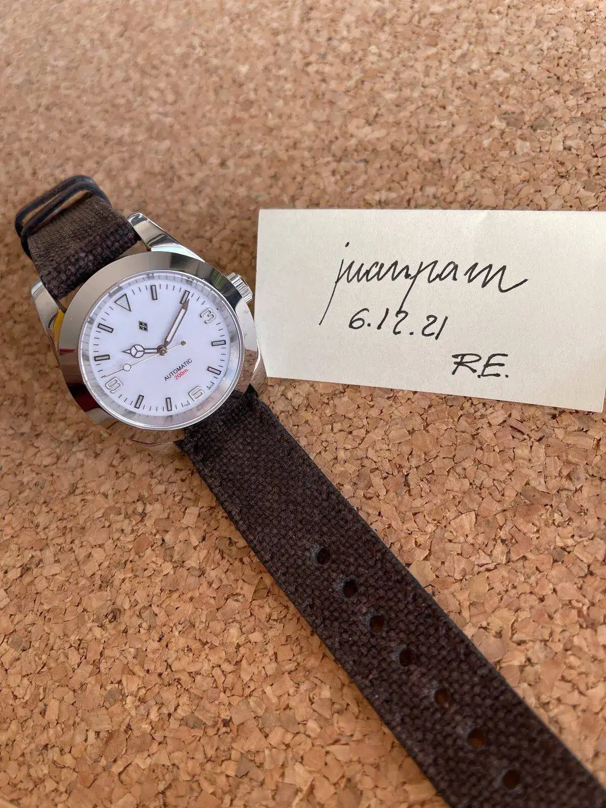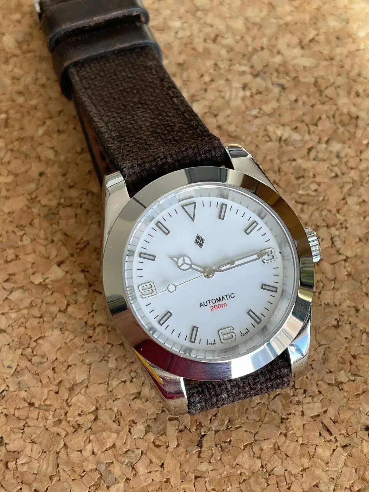 Procedente de un cambio Vendo precioso mod con caja genérica explorer de acero pulido de 39mm, cristal de zafiro, corona y tapa trasera roscadas, dial explorer blanco de Dagaz Watch el cual va acompañado de una correa del maestro artesano José María Aguilar realizada en cuero/canvas con acabado distressed color marrón y de medidas 20/20 y 80/125, muy cómoda de llevar y con poquísimo uso.