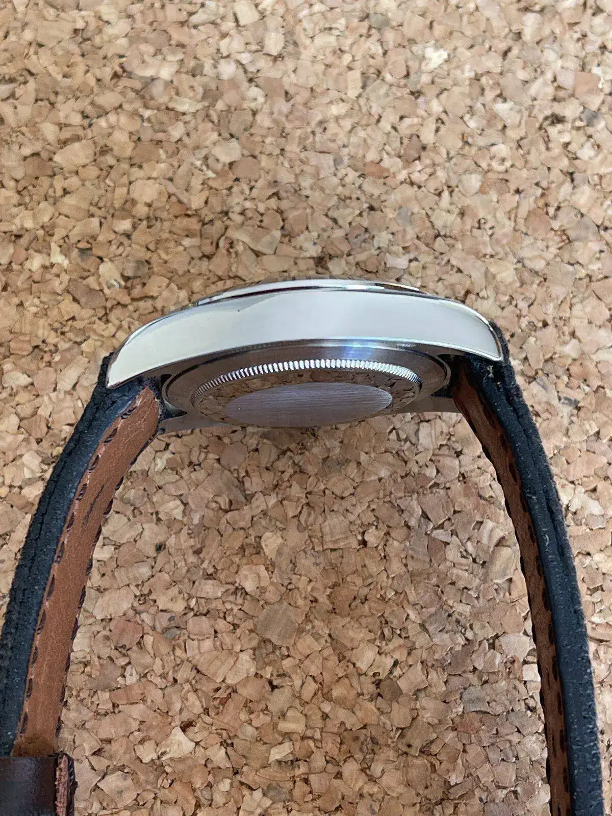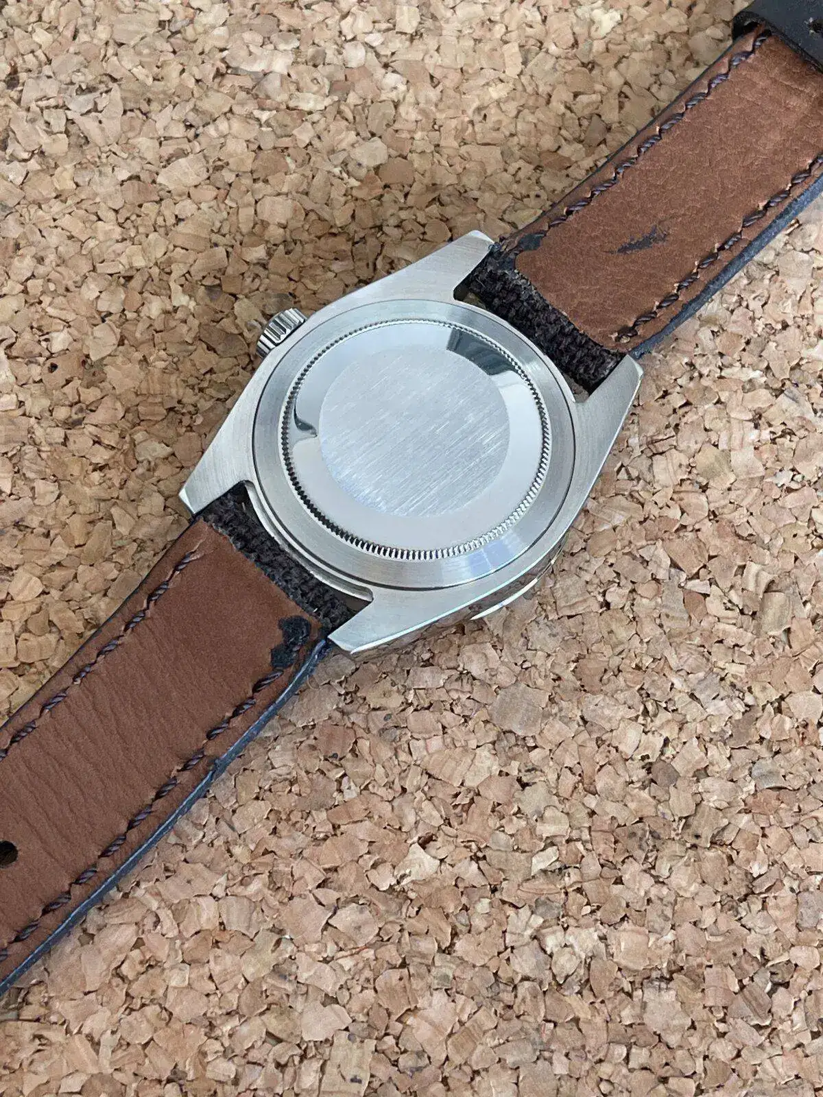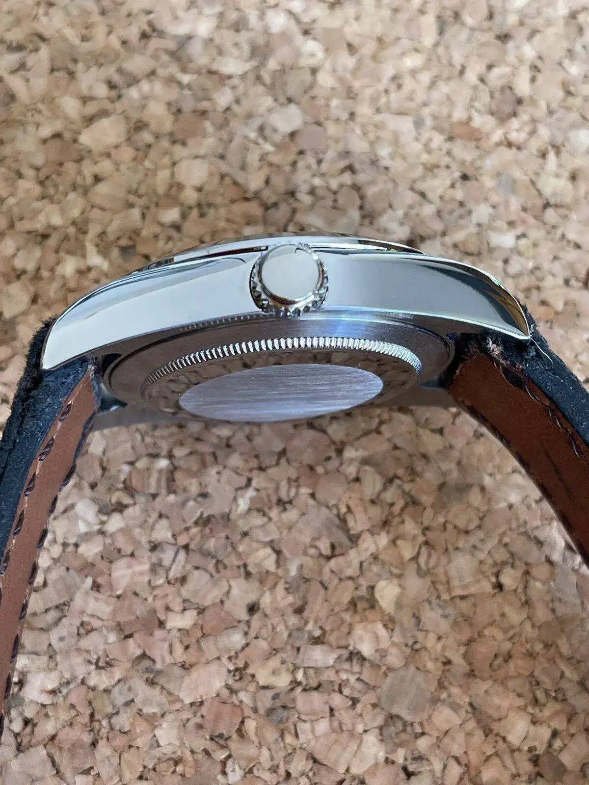 Procedente de un cambio Vendo precioso mod con caja genérica explorer de acero pulido de 39mm, cristal de zafiro, corona y tapa trasera roscadas, dial explorer blanco de Dagaz Watch el cual va acompañado de una correa del maestro artesano José María Aguilar realizada en cuero/canvas con acabado distressed color marrón y de medidas 20/20 y 80/125, muy cómoda de llevar y con poquísimo uso.