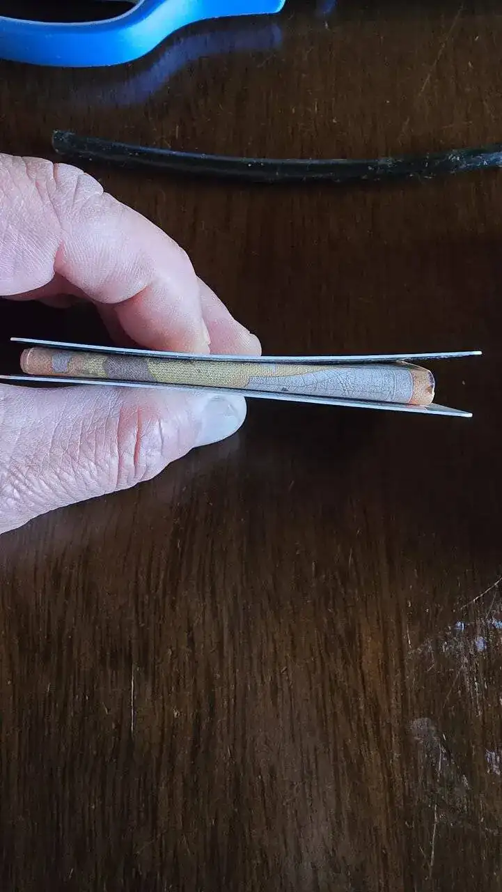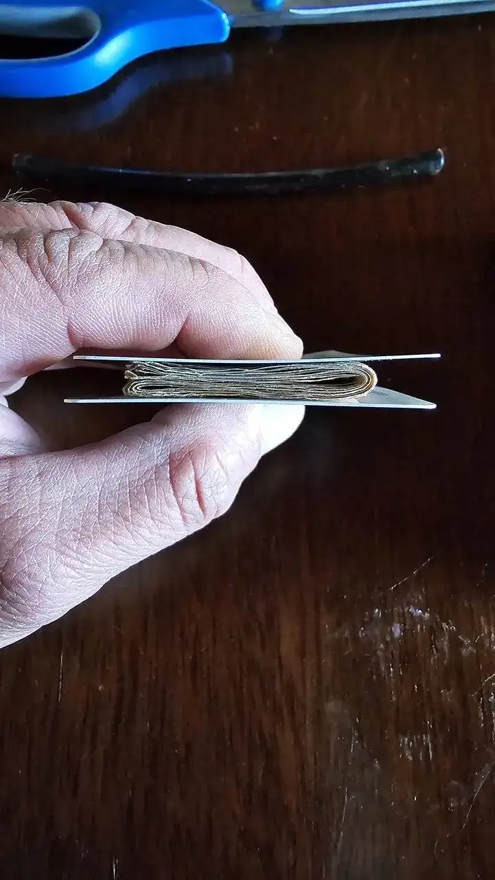 Simplemente doblamos los billetes en 2 partes y ponemos el fajo entre las tarjetas , introducimos tarjetas y fajo en el tarjetero , y sellamos con tubo de plástico previamente cortado a medida y cortando a lo largo del tubo el sobrante , de tal forma que al quedar abierto , este pueda introducirse en el espacio entre tarjeta y tarjeta .. de esta forma queda oculto el espacio secreto y de igual forma impermiabiliza el espacio no dejando entrar ni agua ni polvo...