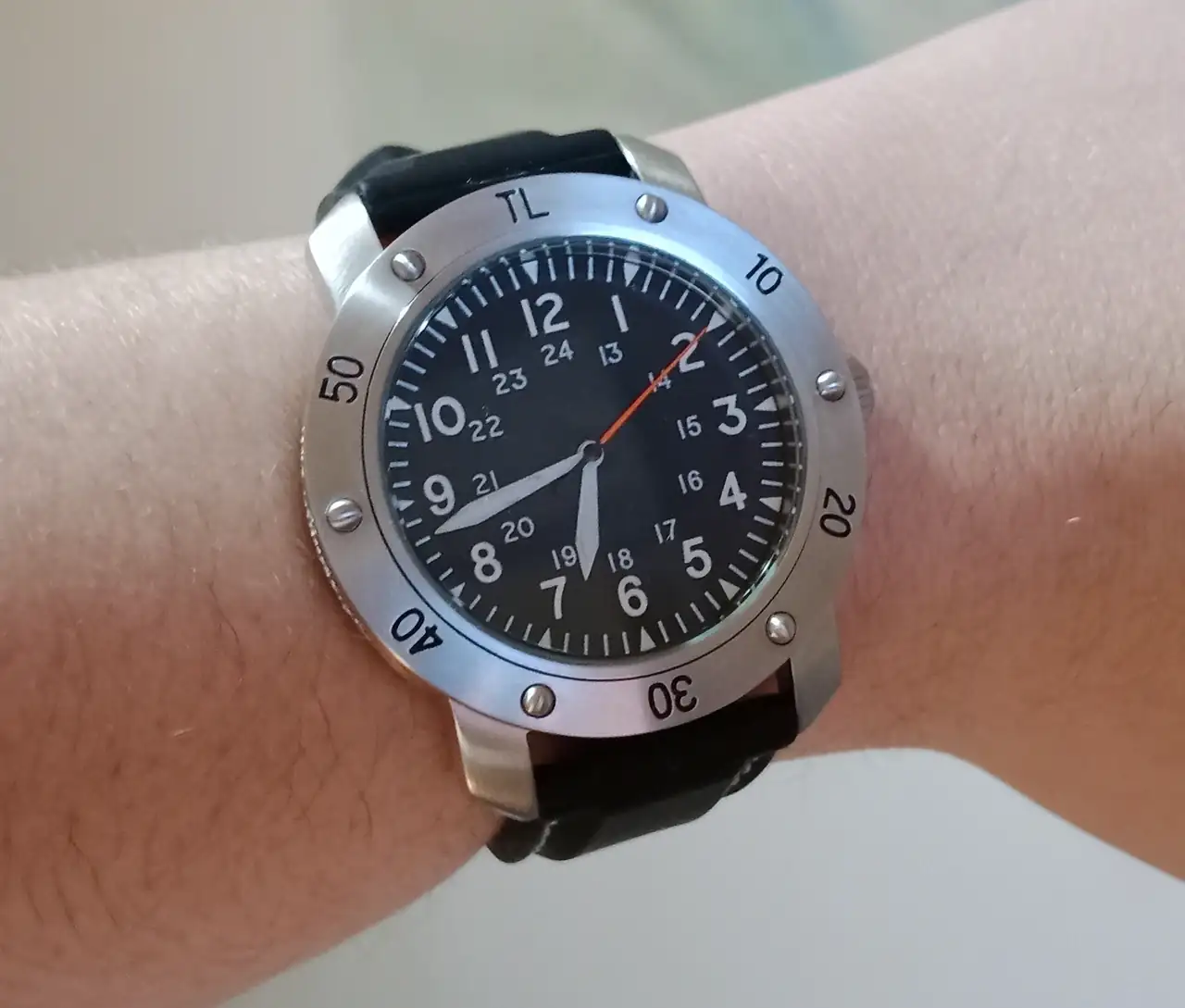 cambié el dial por uno menos amarillo y con más información. al ser de 33,5 mm las opciones no eran tantas como si fuera de 28,5, vi uno tipo field americano del Vietnam, cambié la agujas, al final con cada una de un juego distinto para que marcasen lo que tenían que marcar, las cepillé para que parecieran familia y envejecí ligeramente la esfera porque.. no estoy seguro, estoy ensayando para otros proyectos... y me quedó este Field adiverado paellera para 6 comensales: