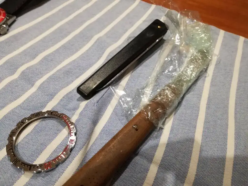 El bisel es de otra unidad y lo envejeci previamente durante dos semanas mediante inmersion en vinagre y sal a temperatura ambiente. La caja fue lijada con la dremel para quitarle el brillo y luego repasada con una lija fina.