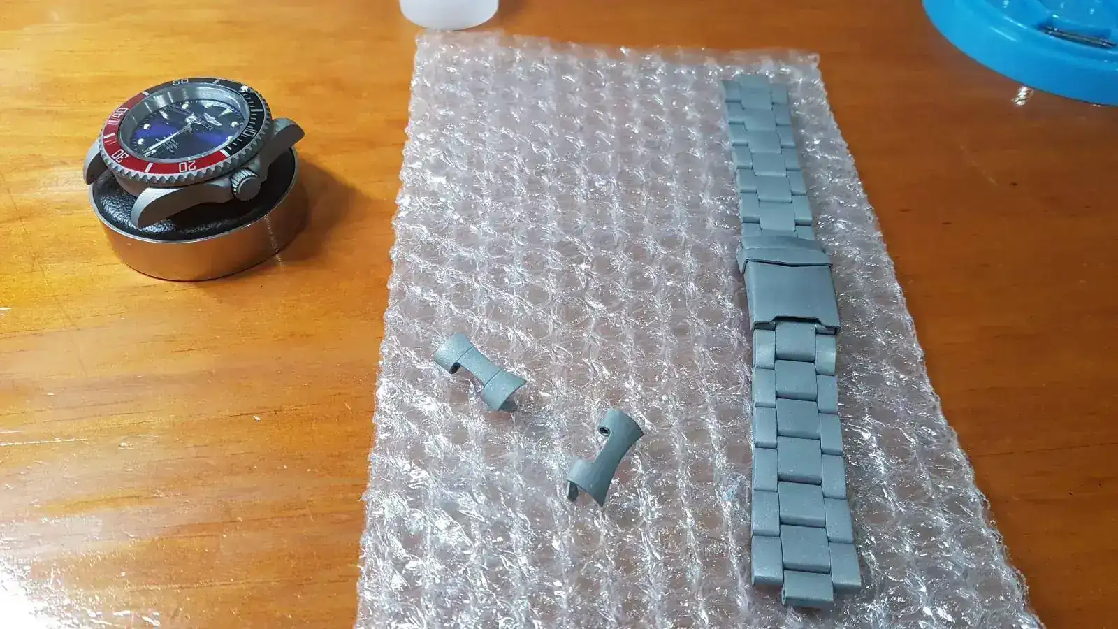 Lo primero que hice fue lijar y quitar los grabados laterales que invicta pone en la caja (a estos de invicta les gusta dejar marca...) y el armis con ayuda de la dremel, una vez lijados me dispuse a arenar la caja con mi pistola de chorro de arena, para el arenado use un grano de óxido de aluminio que le deja cierto toque negro.
