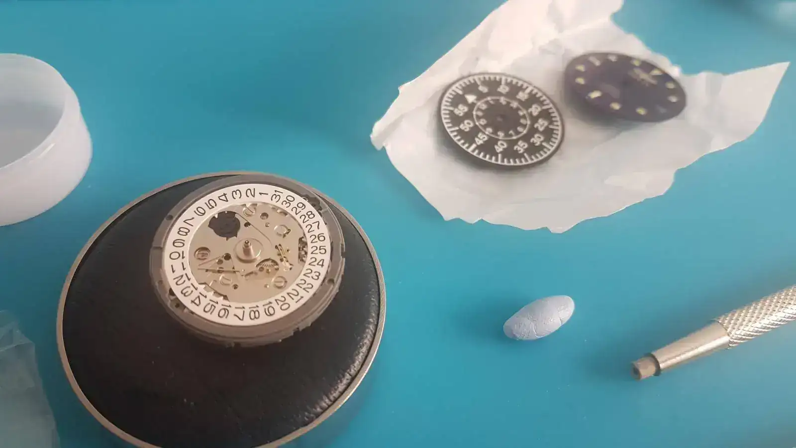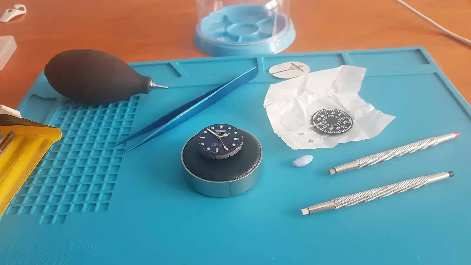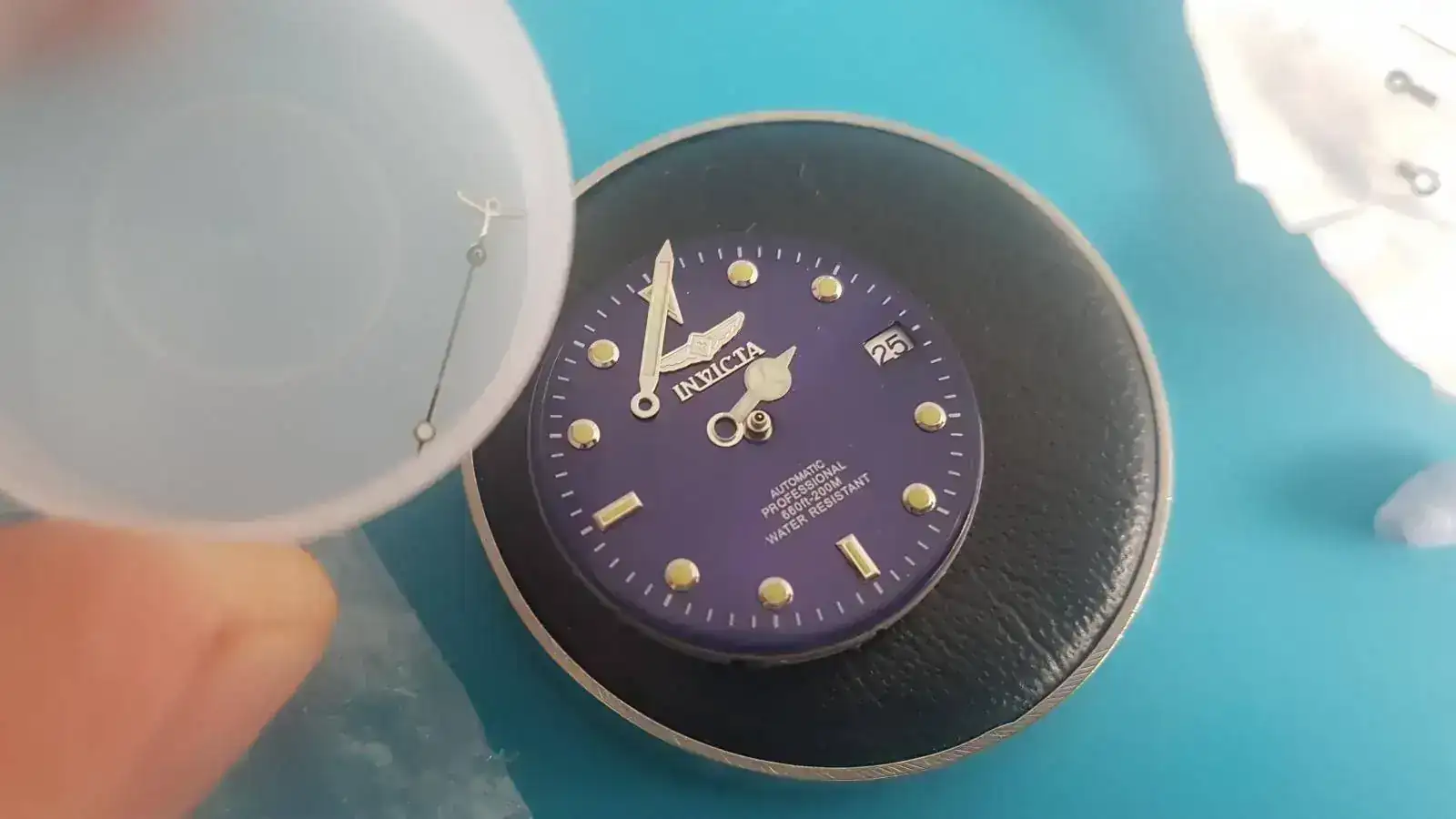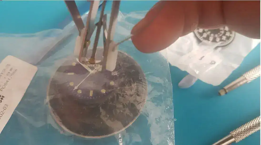 Pues nada, para no enrollarme mucho más lo siguiente es poner el dial y las agujas para lo cual me ayudo de la masilla "pega todo" para sujetarlas y que sea más sencillo de meter con las herramientas sin que se caigan, se doblen, se rallen o demás: