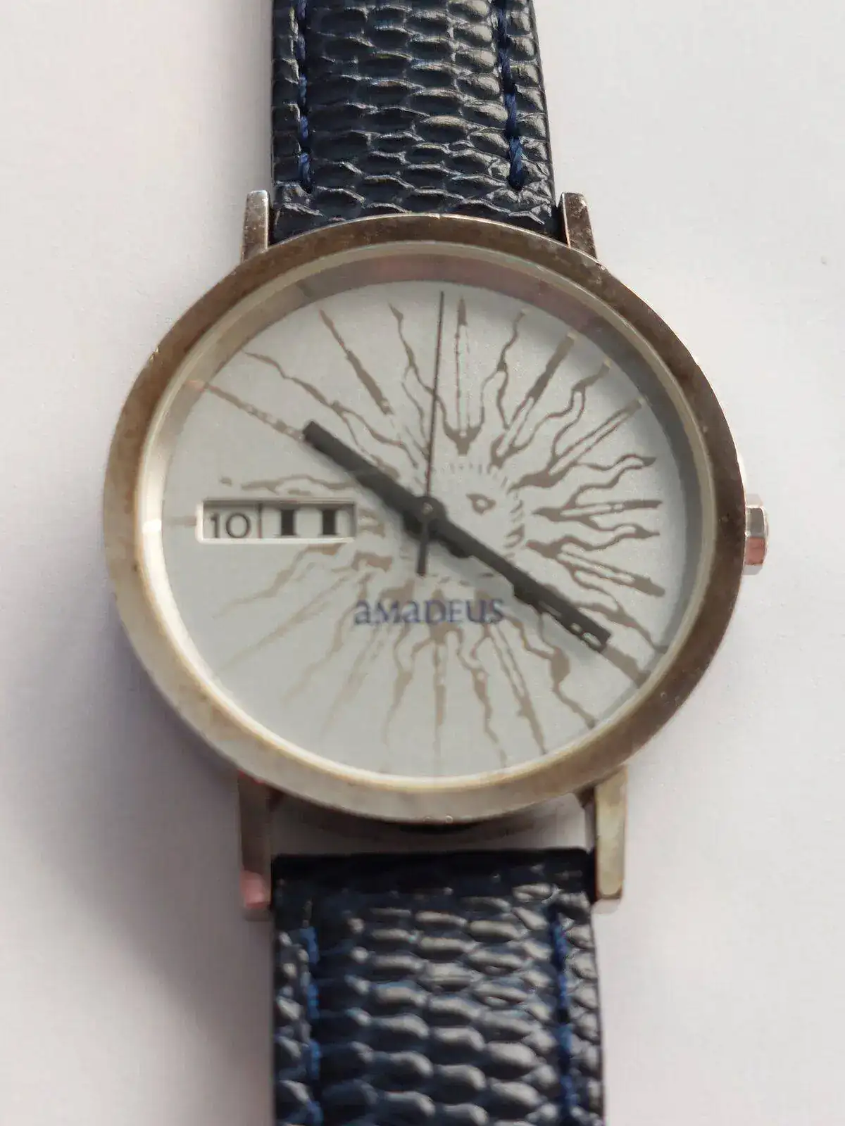 Estéticamente la esfera nada tiene que ver con el clásico modelo de estaciones de tren, y lleva fecha y día de la semana a las 9h, el día en números romanos. Esfera plateada con un sol. Cristal atrás.