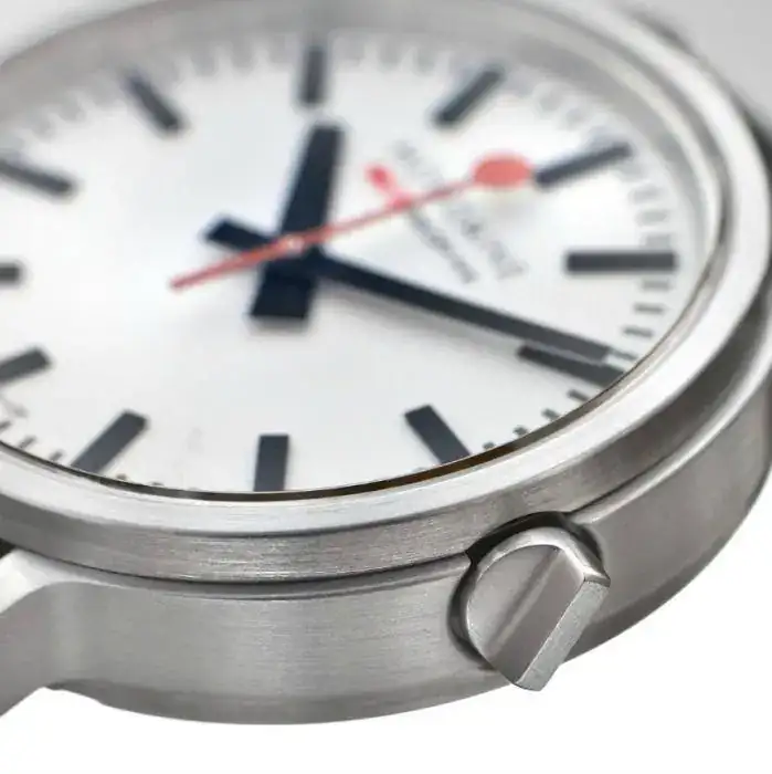 El movimiento es interesante, pero el nuevo diseño de la caja es muy agradable. En acero, el caso pulido es de 41 mm de ancho y cuenta con un diseño industrial más moderno, frente al Mondaine típico. Una característica única es la corona, que está diseñada para parecerse a un interruptor basculante. Esperemos que no sea demasiado difícil de sacar, pero se ve bien.