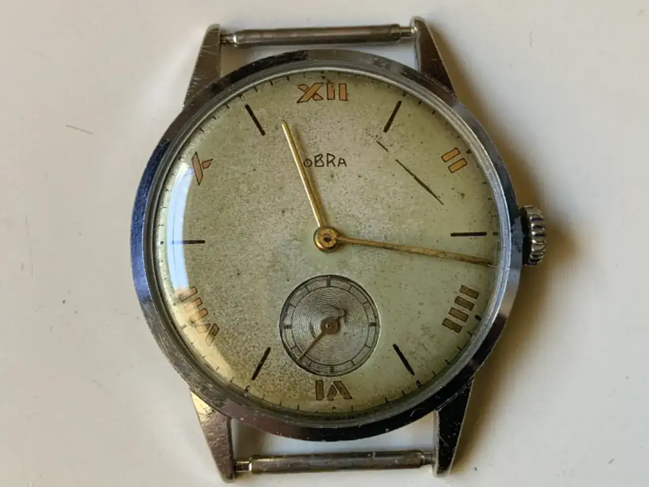 Se trata de un reloj Mondia según luce en su esfera, con números y agujas pintados (pero sin luminiscencia de ninguna clase) y un tamaño "habitual para la época", unos 35 mm (17 entre asas -fijas-) que yo ubicaría a finales de los años 50 o principios de los 60. Fondo tipo burbuja a presión sin apenas marcas de manipulación que yo, en vista de que mantiene un tiempo decente, preferí no tocar ni tratar de abrir.