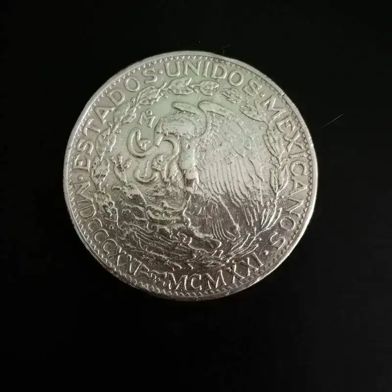 Anverso.- El escudo de armas con el águila de perfil, postrada sobre un nopal y con una serpiente en el pico; la ceca “Mo” y en la parte superior la leyenda “Estados Unidos Mexicanos”, con una rama de laurel y otra de encino. En la parte inferior, escrito con números romanos: “MDCCCXXI” (1821), año en que se consumó la Independencia, y a la derecha, también con numeración romana, “MCMXXI” (1921), año que conmemora el centenario de la consumación.