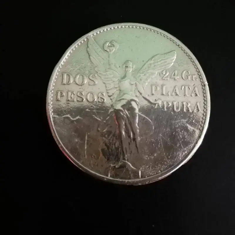 Reverso.- Tiene una figura femenina de la “Victoria”, con un fondo de montañas, “Dos Pesos”, “24 Gr. Plata Pura”.
