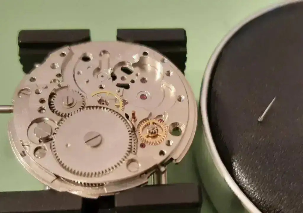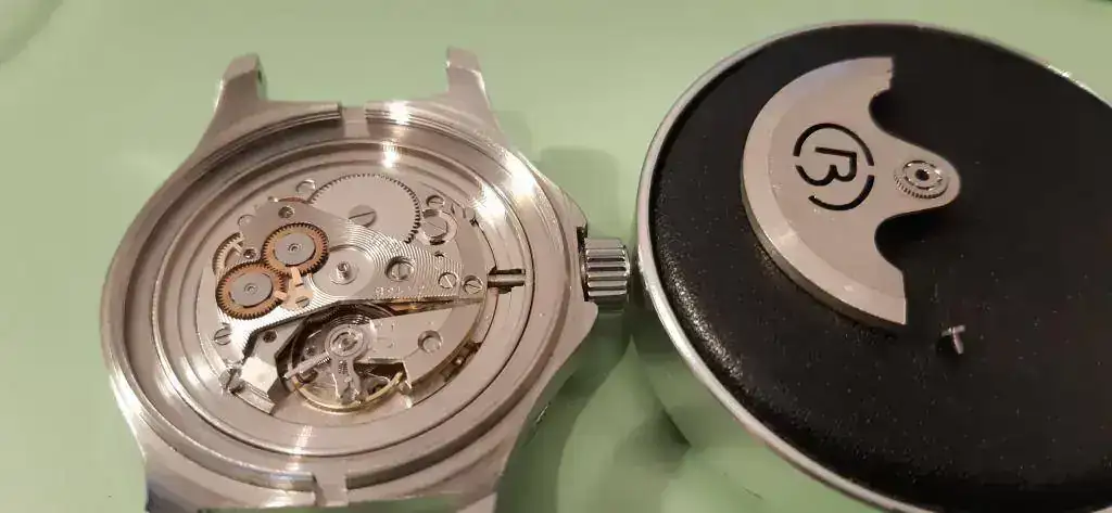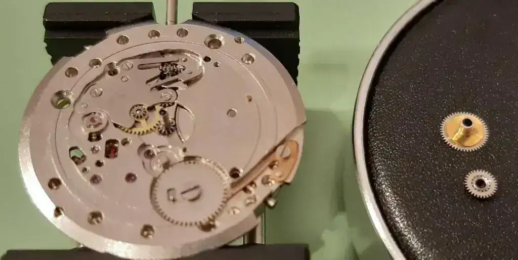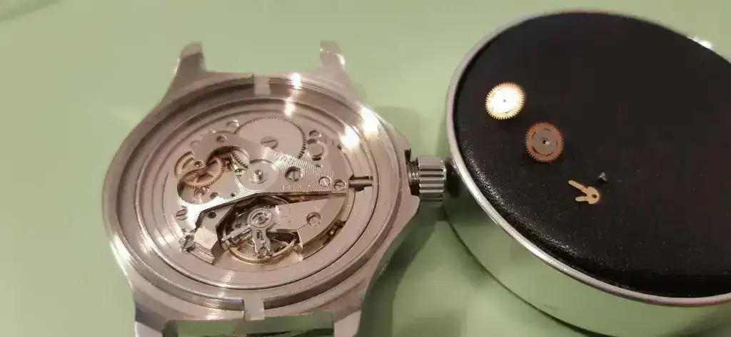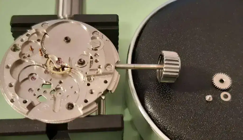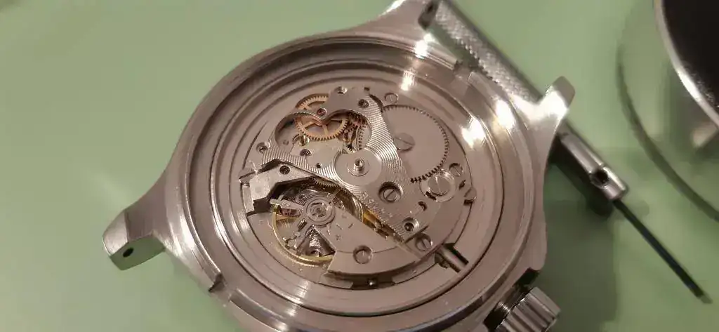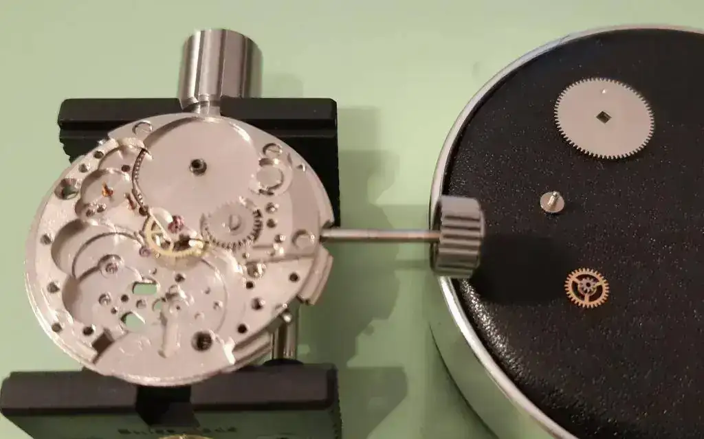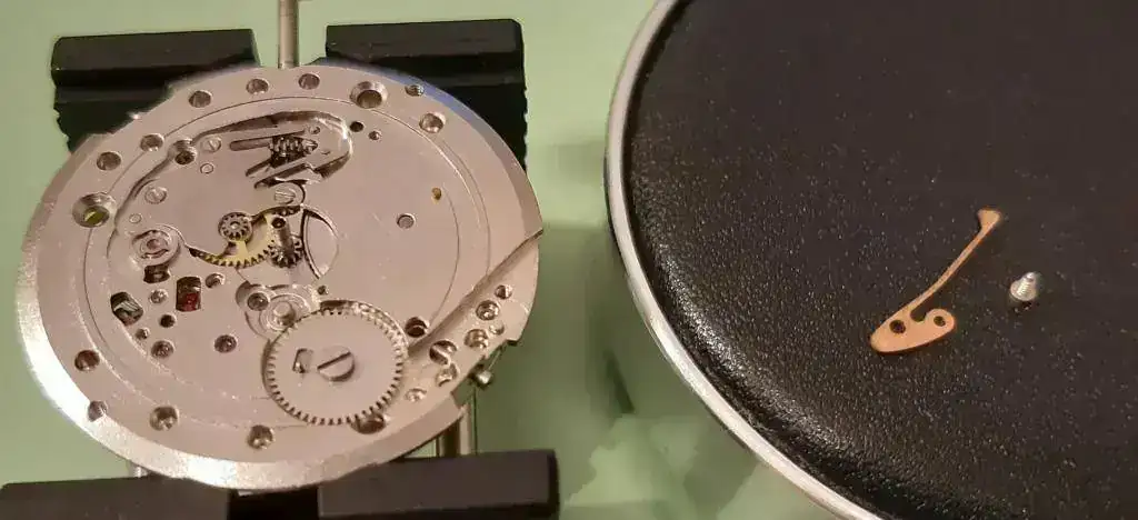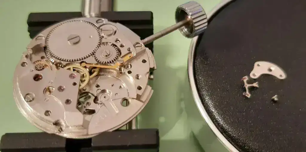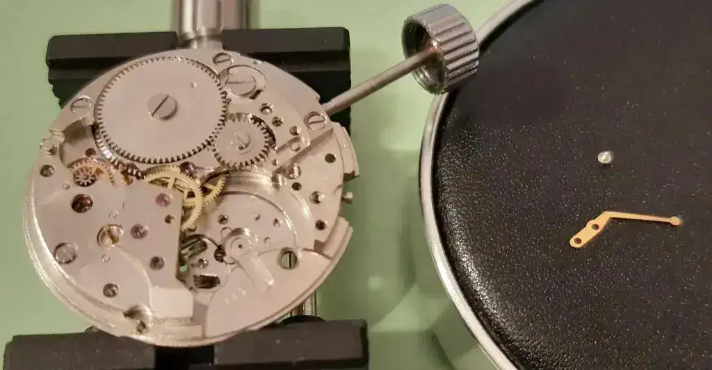 Damos la vuelta al movimiento, colocamos el dial y las agujas, sacamos la tija, metemos el movimiento en la caja, colocamos la bata y metemos la tija (todo esto está explicado hasta la saciedad).