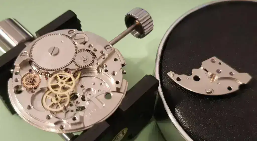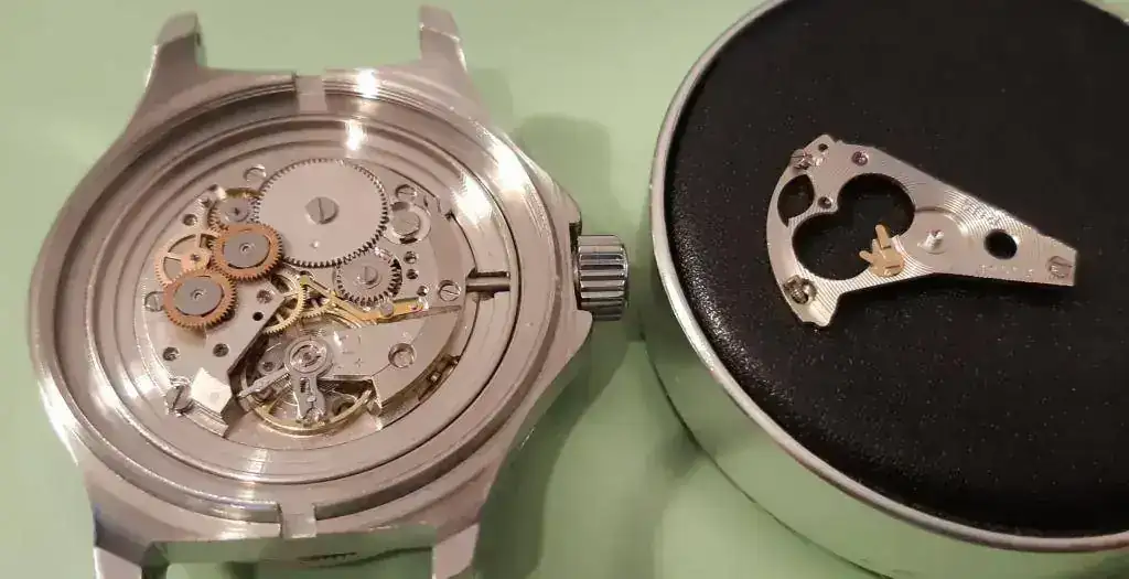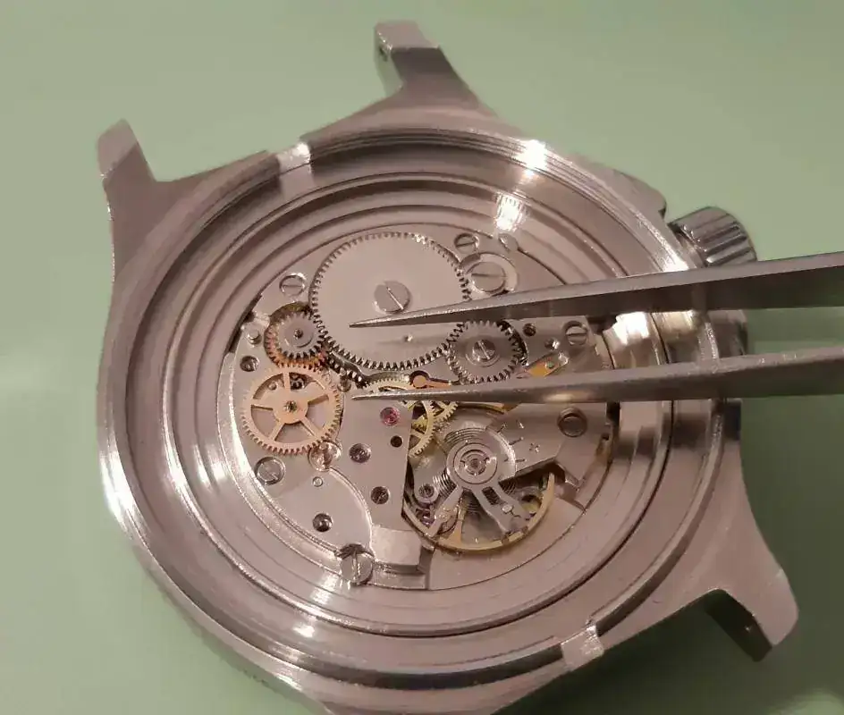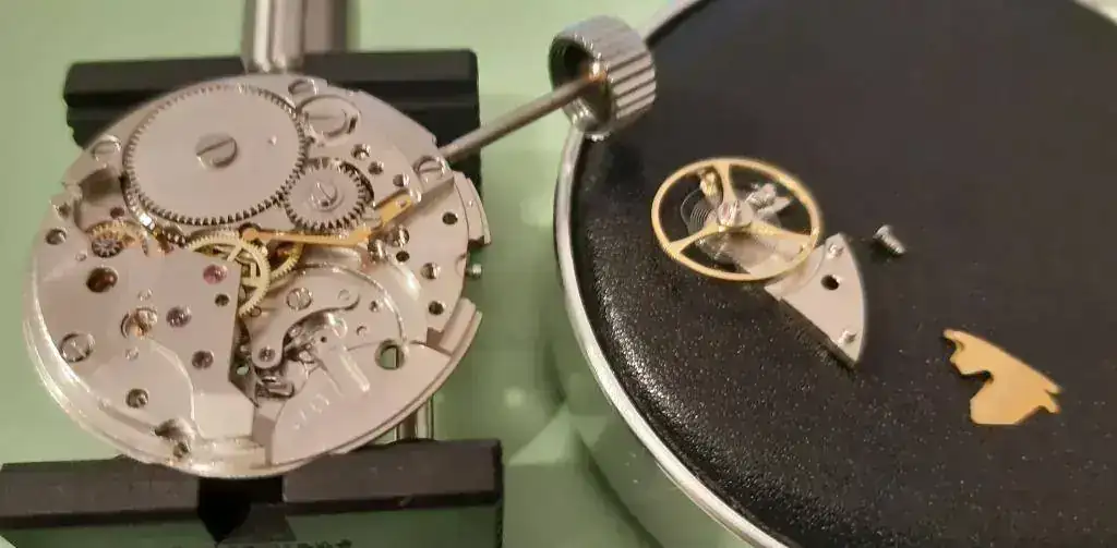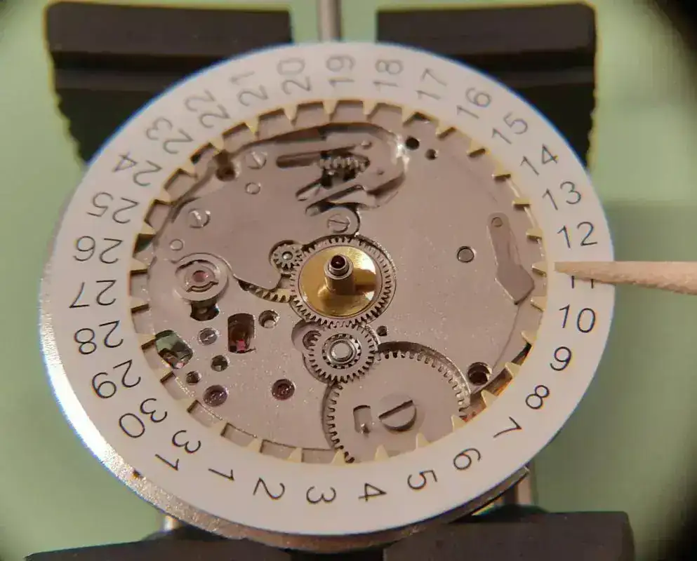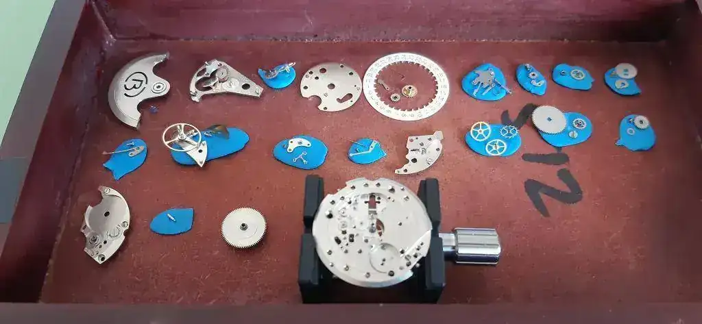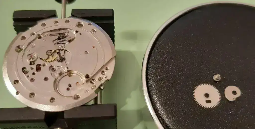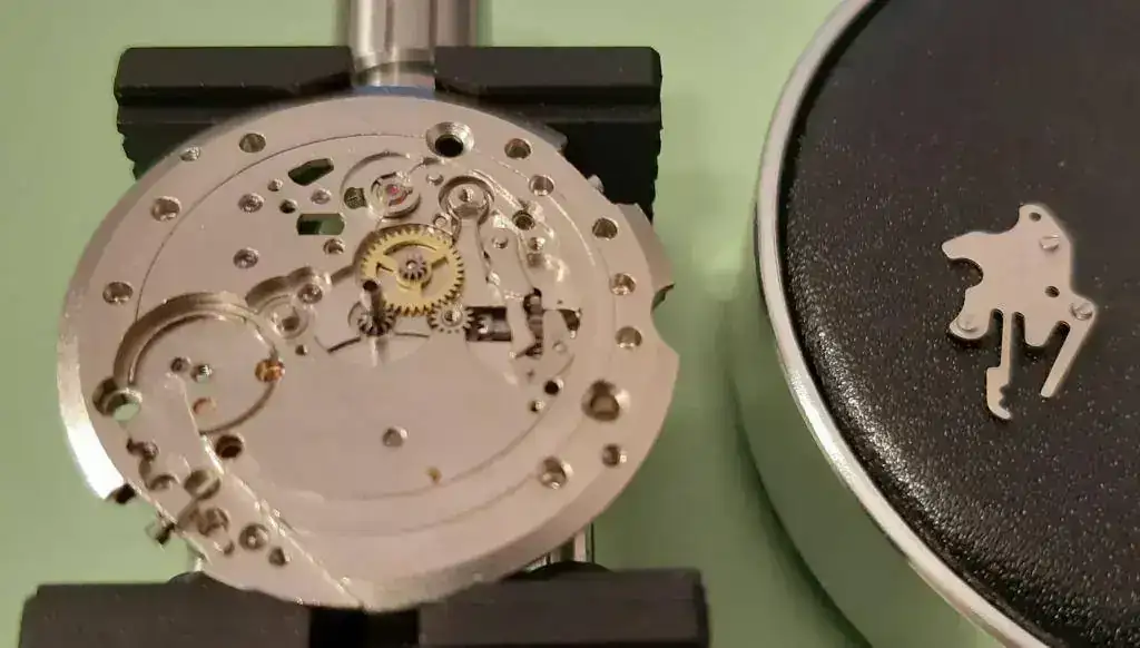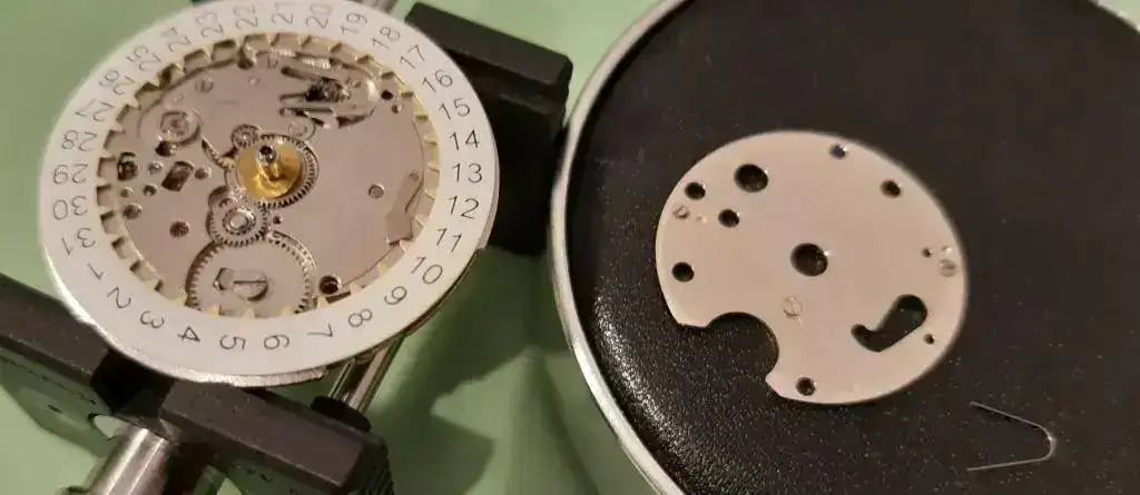 Damos la vuelta al movimiento, colocamos el dial y las agujas, sacamos la tija, metemos el movimiento en la caja, colocamos la bata y metemos la tija (todo esto está explicado hasta la saciedad).