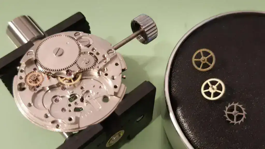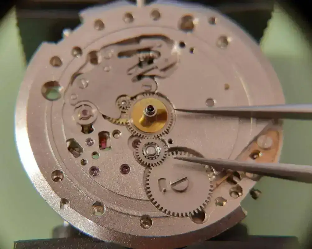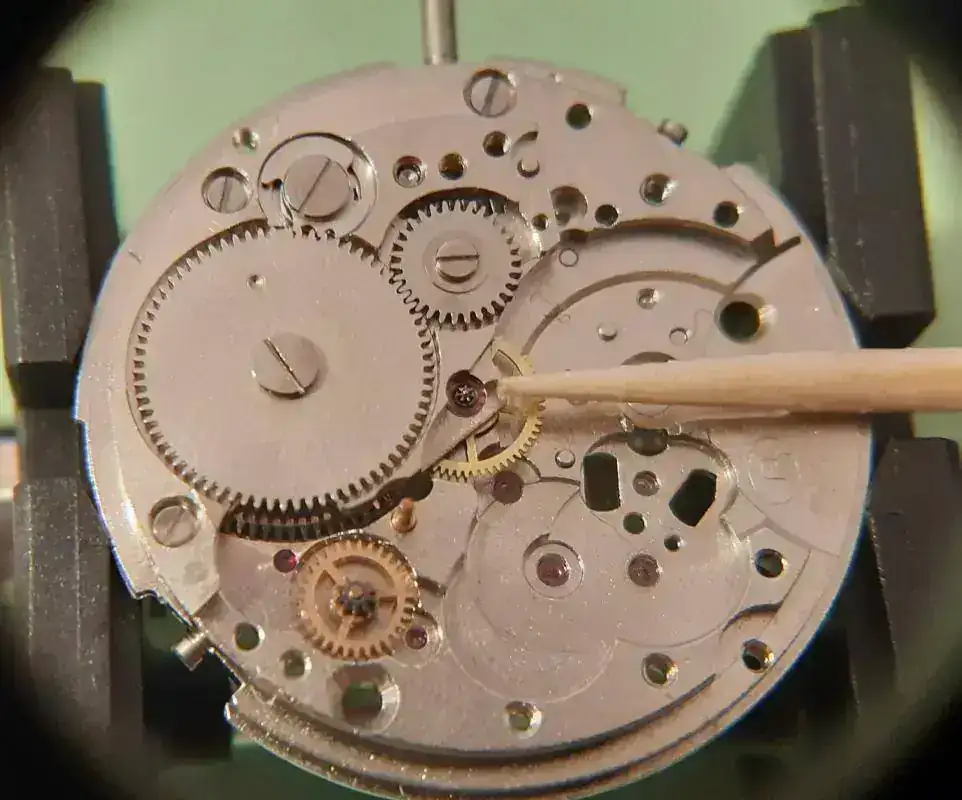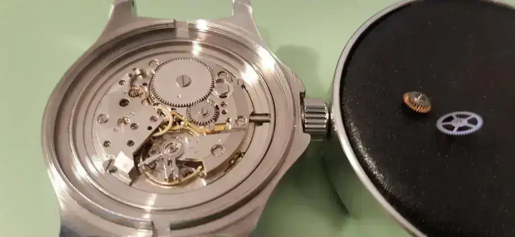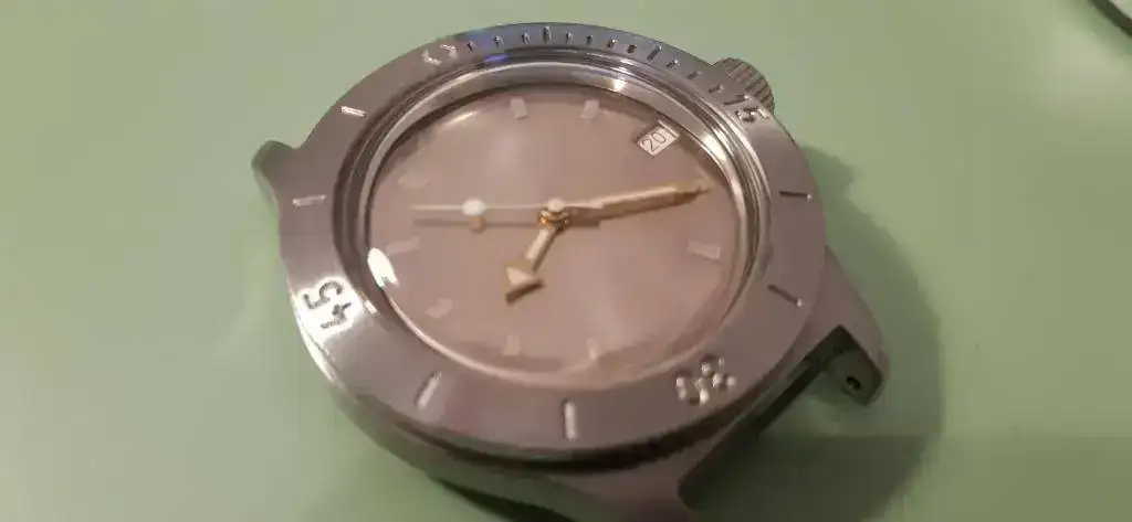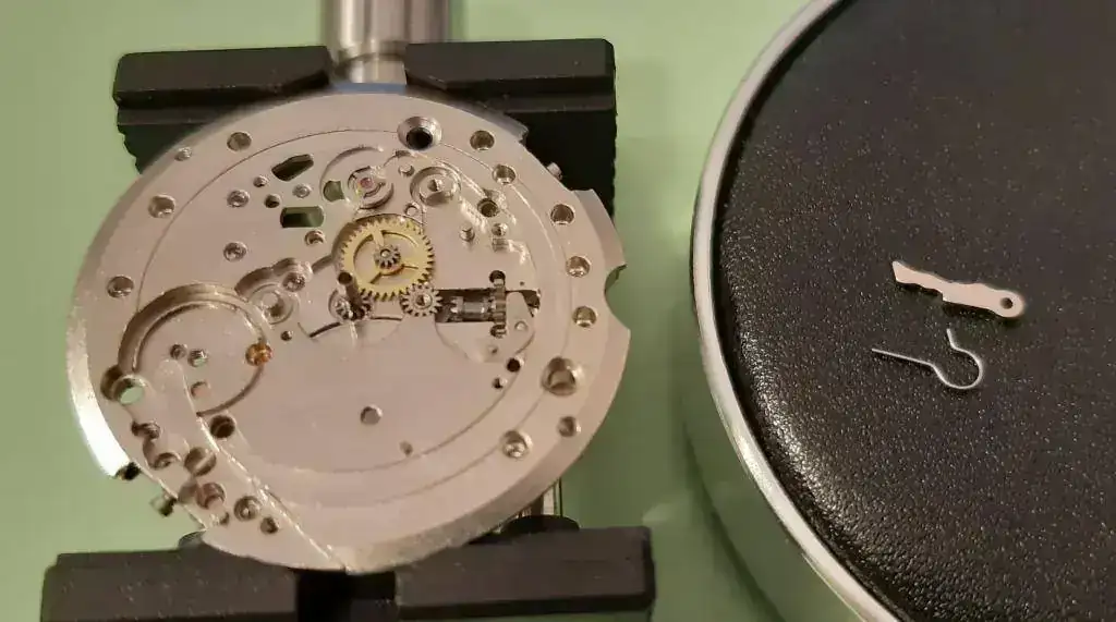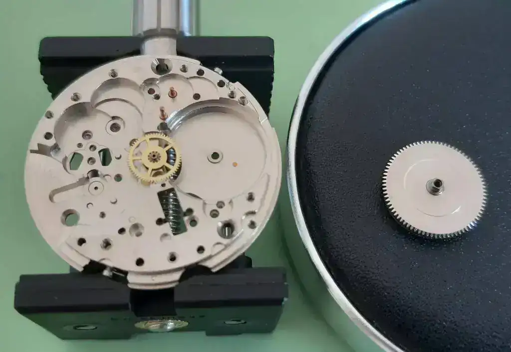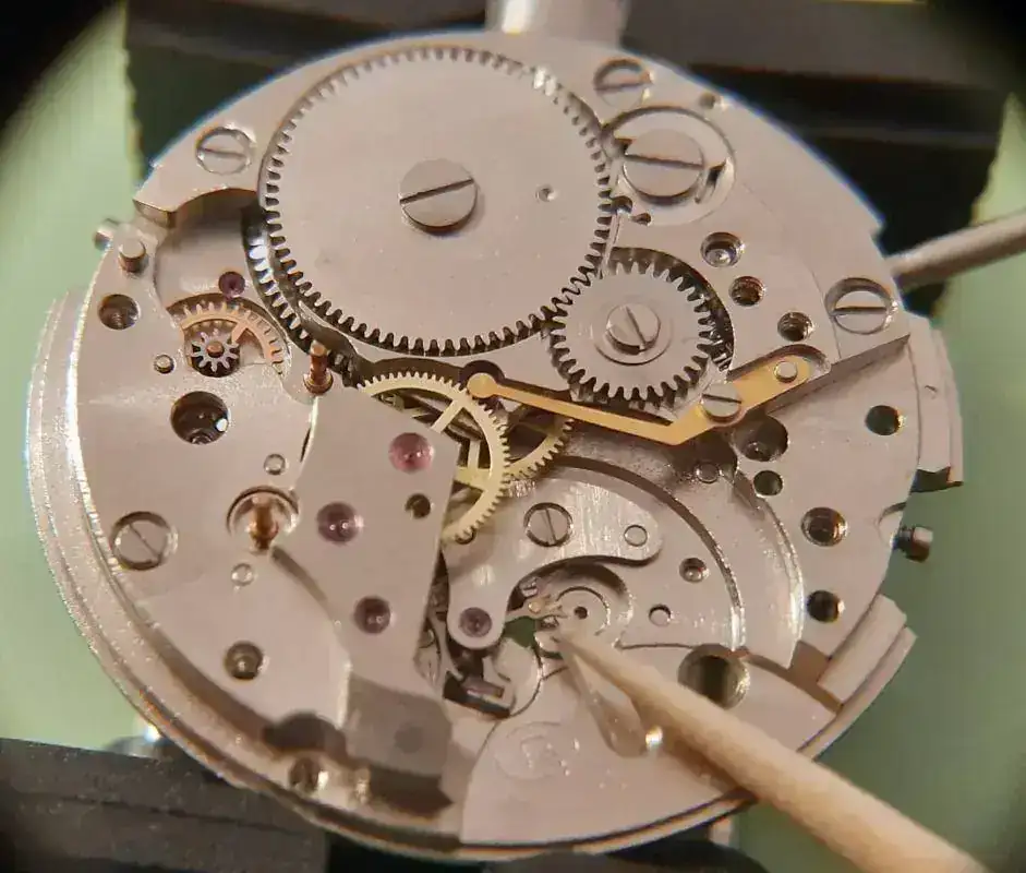 Damos la vuelta al movimiento, colocamos el dial y las agujas, sacamos la tija, metemos el movimiento en la caja, colocamos la bata y metemos la tija (todo esto está explicado hasta la saciedad).