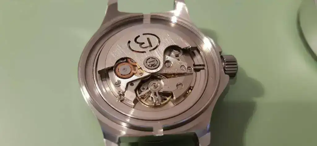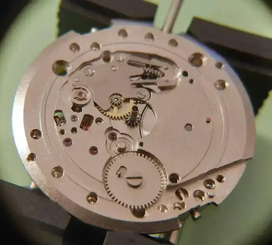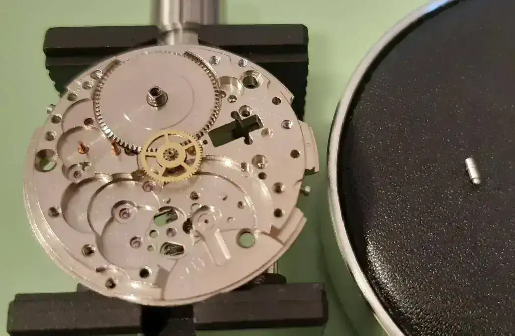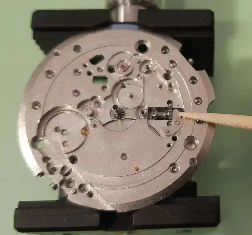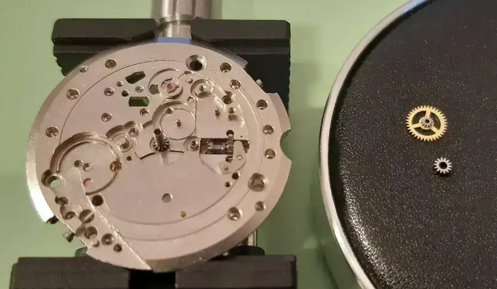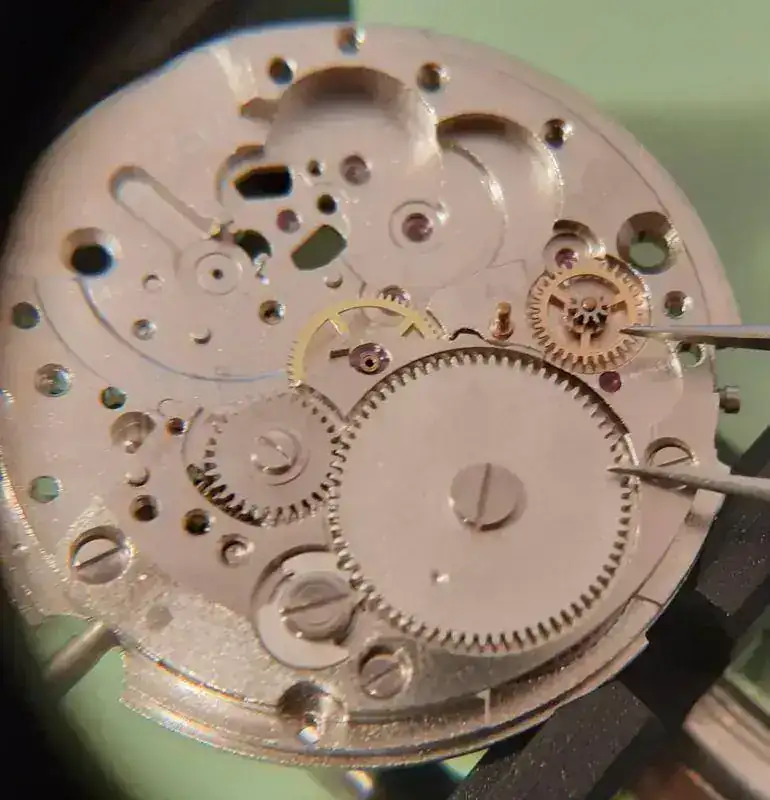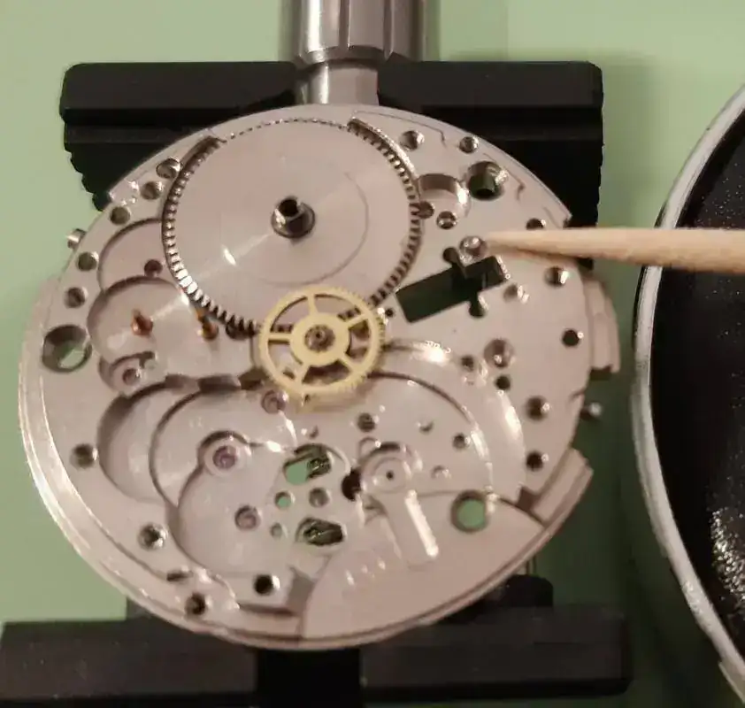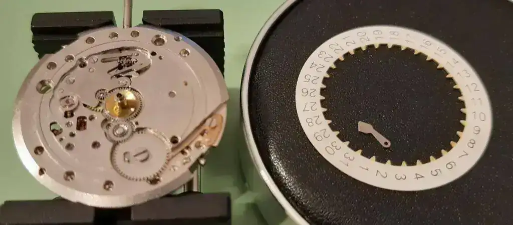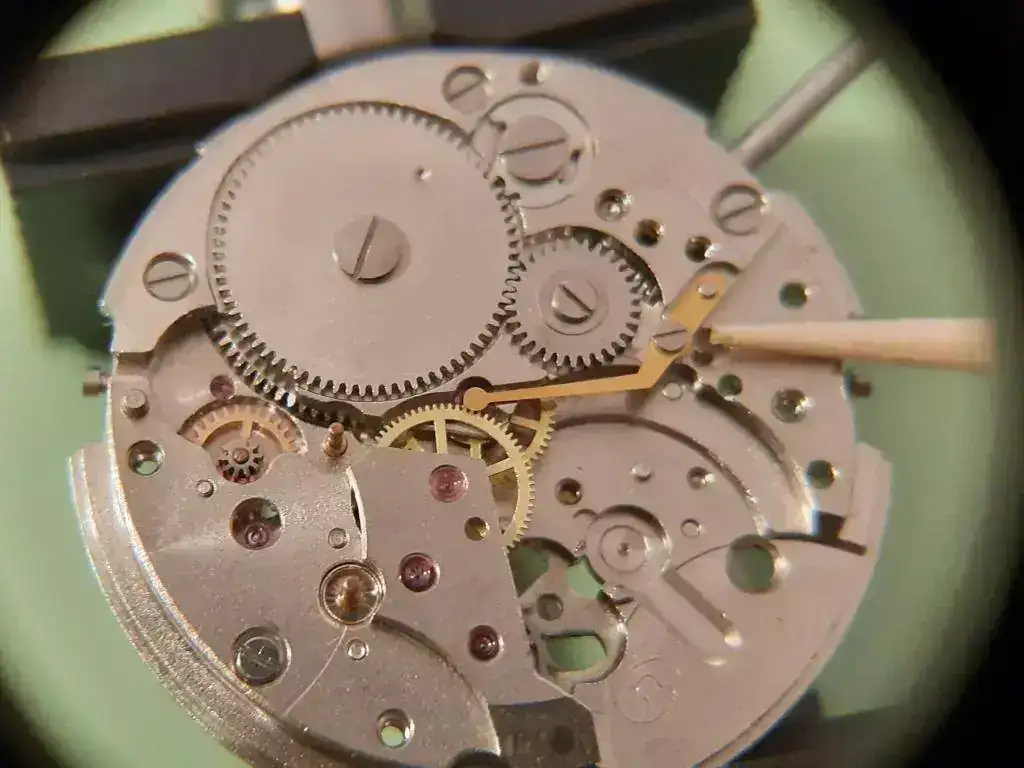 Damos la vuelta al movimiento, colocamos el dial y las agujas, sacamos la tija, metemos el movimiento en la caja, colocamos la bata y metemos la tija (todo esto está explicado hasta la saciedad).