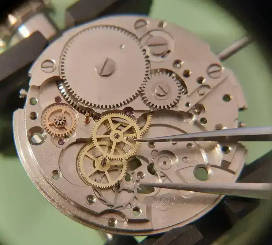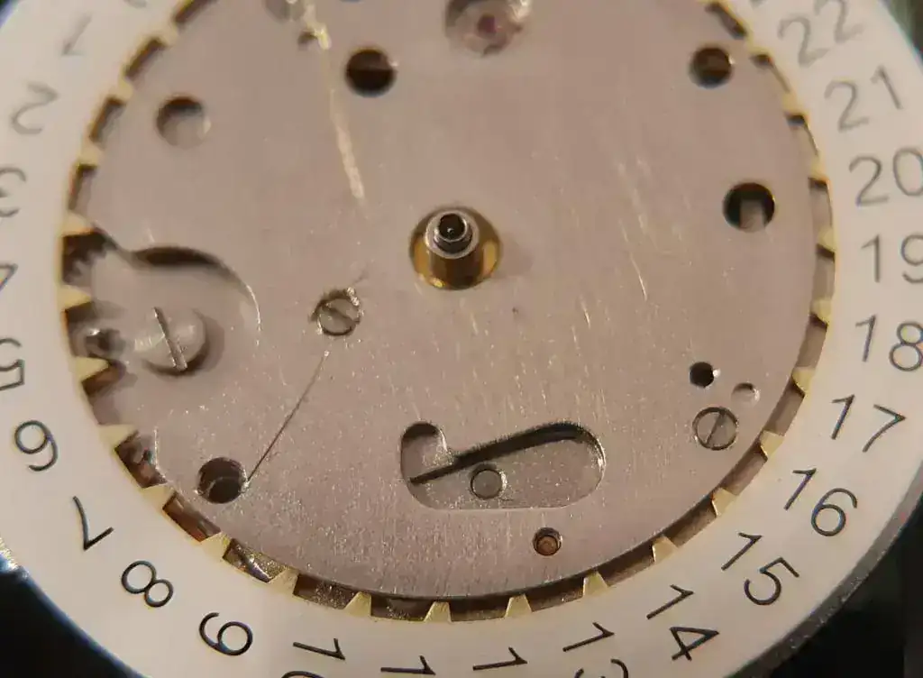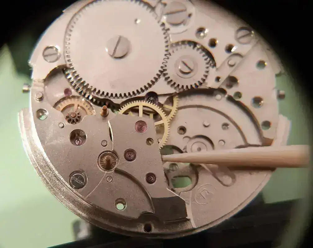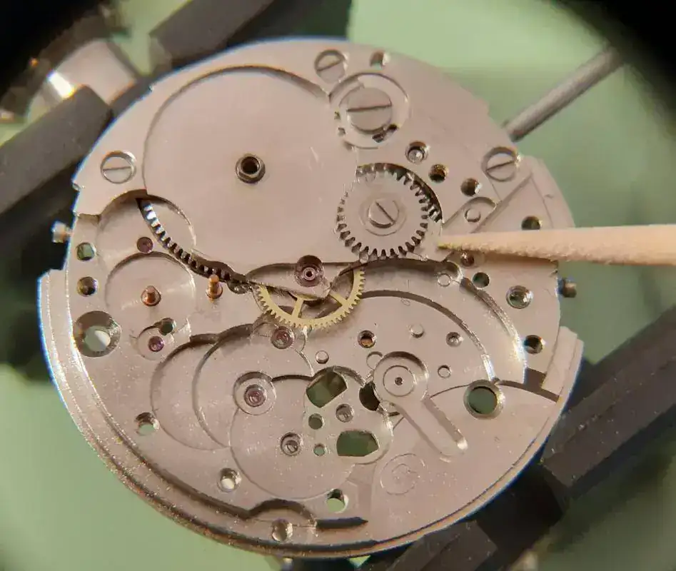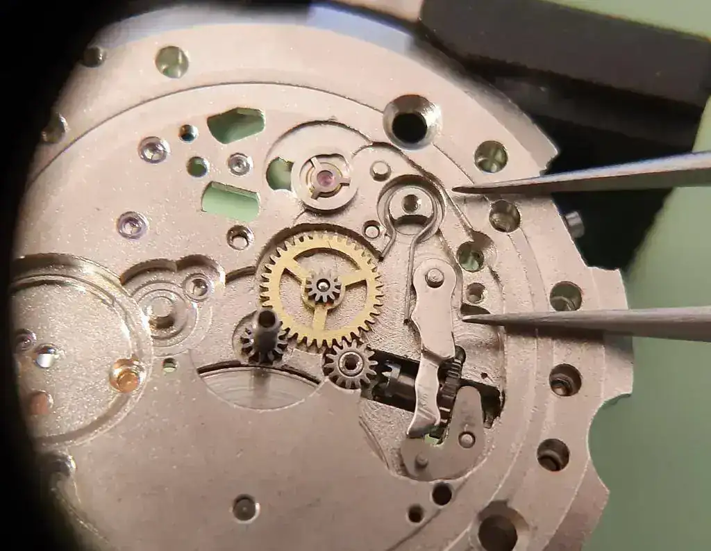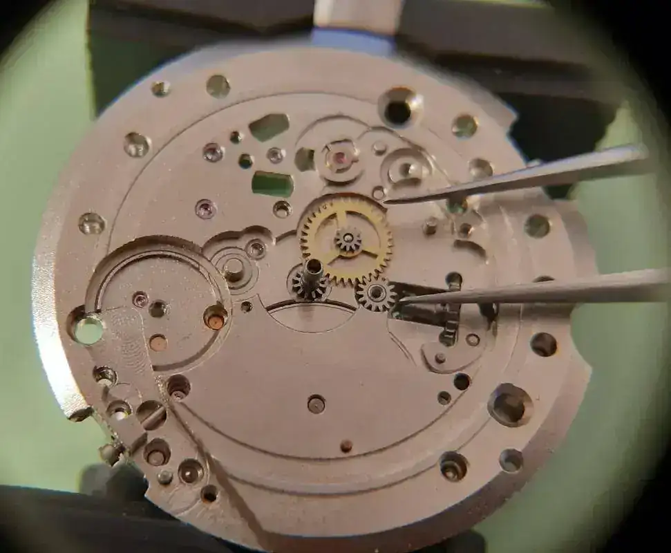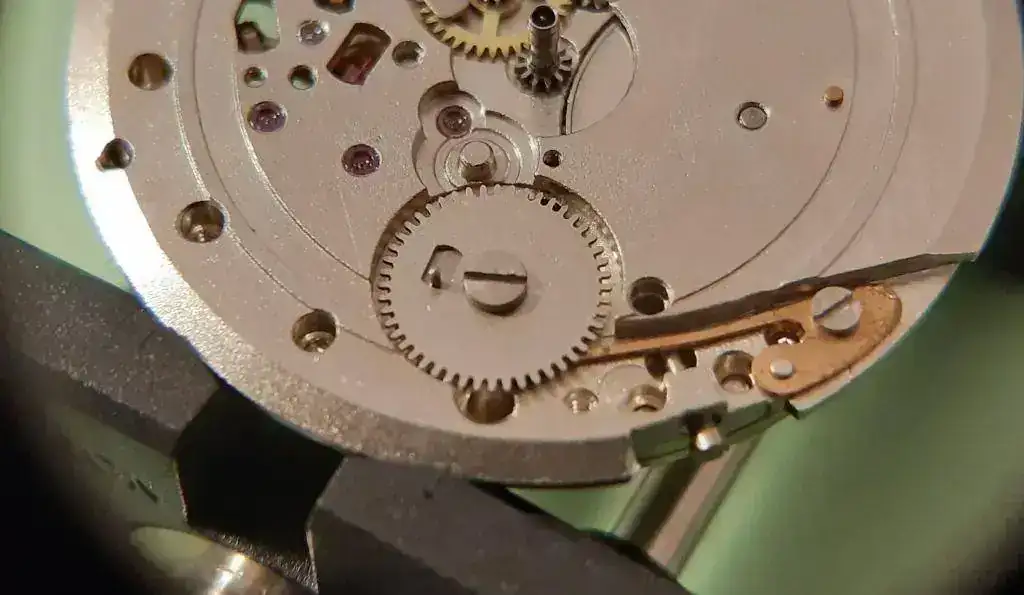 Damos la vuelta al movimiento, colocamos el dial y las agujas, sacamos la tija, metemos el movimiento en la caja, colocamos la bata y metemos la tija (todo esto está explicado hasta la saciedad).
