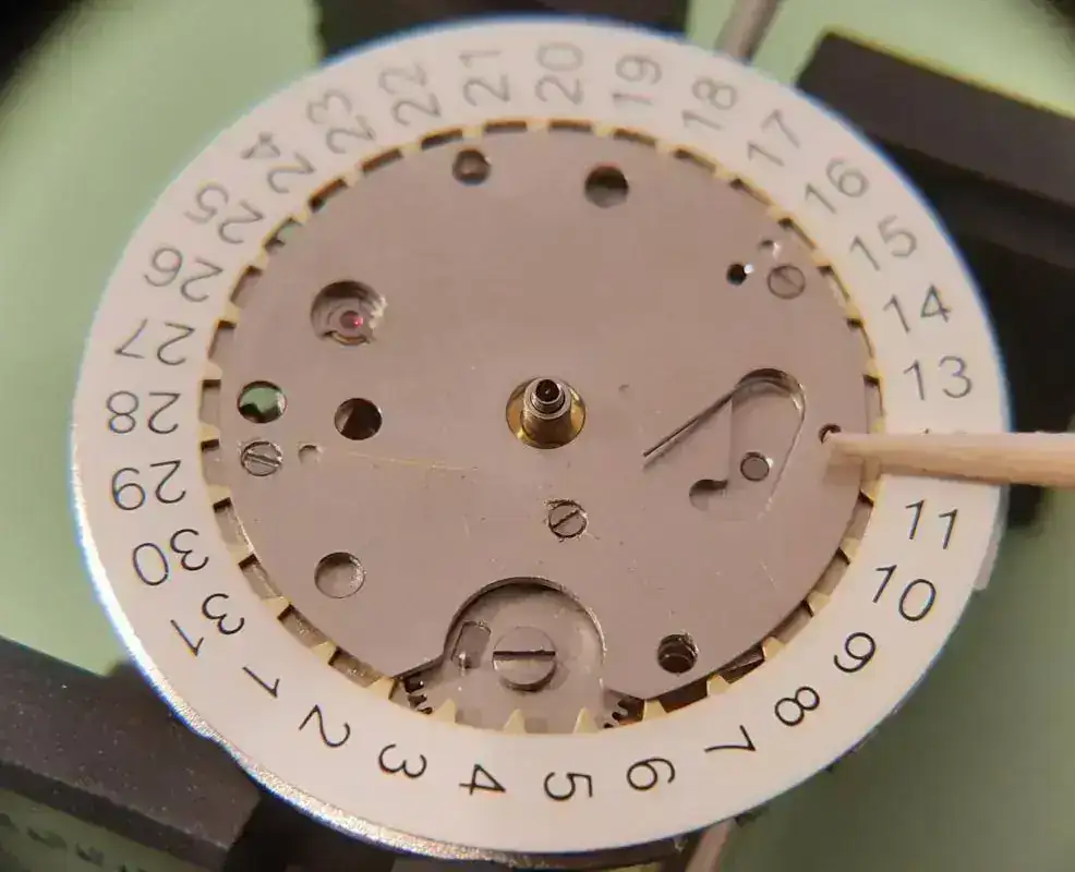 44 y 45.- Colocamos el resorte del cambio de fecha (44): Yo introduzco primero un lado, apoyyo el dedo en la curva del resorte y luego meto el lado superior: