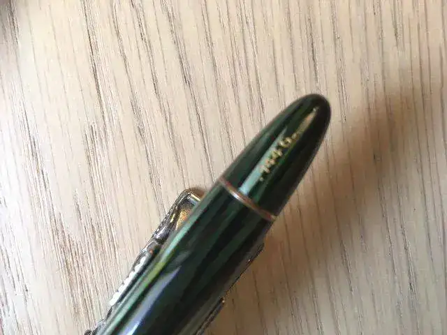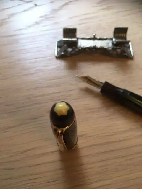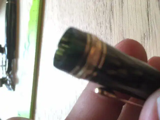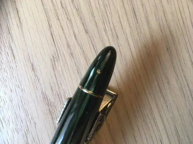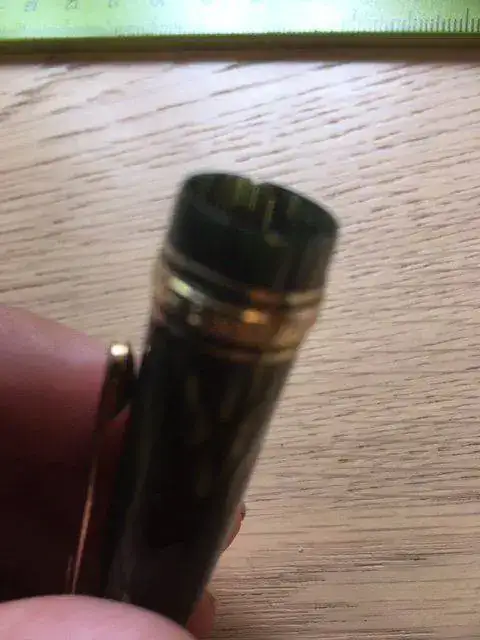 --- La pluma está perfecta en todo lo dicho. El único pequeño signo de paso del tiempo que tiene es una pequeñísima pérdida de celuloide en la boquilla del capuchón, que he fotografiado ampliándola lo más posible. Es estable y no afecta al rededor. Las dos últimas fotos, tomadas a contraluz, lo muestran.