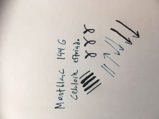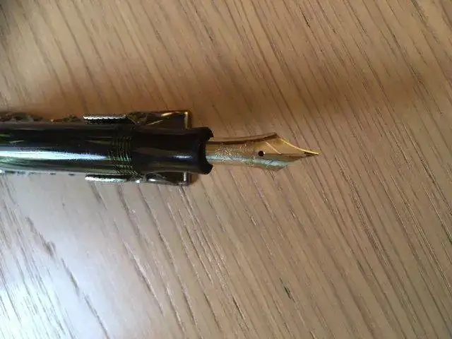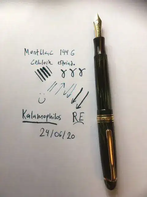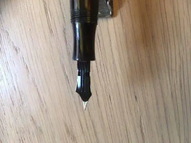 ---El plumín está marcado 14 c 585 y es el correcto para esta pluma. Es un F, pero un F de Montblanc de los años 50: para nosotros esto es un EF si se escribe sin presión y NO es ultrasuave como un plumín moderno: tiene feedback. Su gracia, claro, es la flexibilidad (ved la prueba de escritura). No es un wetnoodle (ningún MB de los 50 es), pero hasta el más conservador de los calígrafos lo llamaría al menos semiflex. Yo lo llamaría semiflexible.
