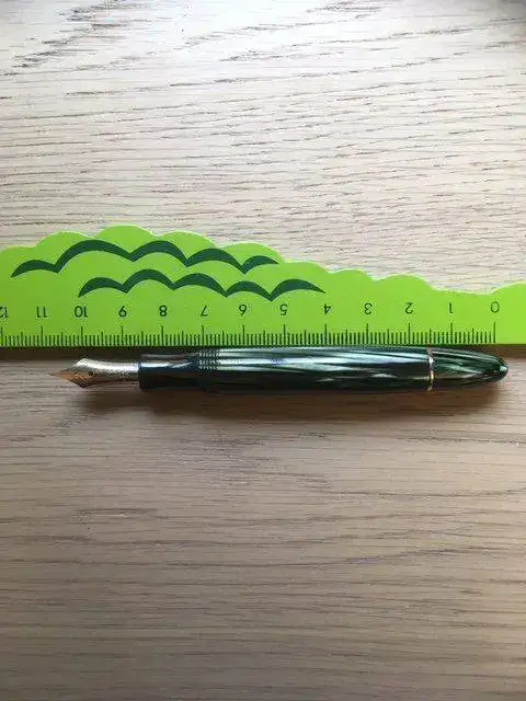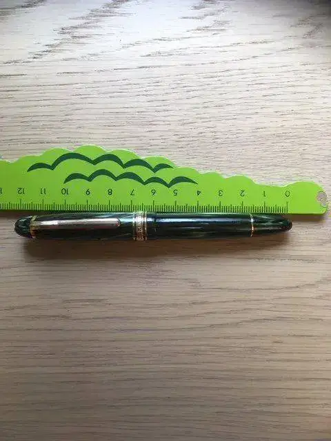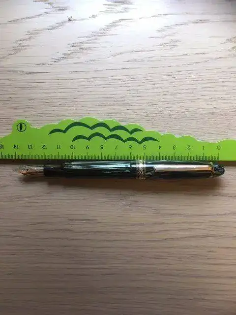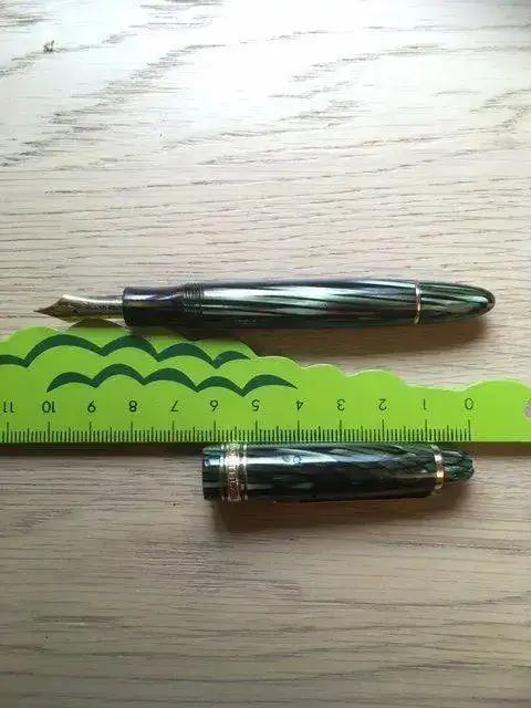 ---Mide 12 cm. cerrada (vean las fotos de mi amigo el cocodrilo) y 14 posteada. Es clavada en tamaño a una Sailor Sapporo o una Pelikan M101, es decir, se escribe perfectamente con ella al mismo tiempo que se lleva perfectamente en el bolsillo.