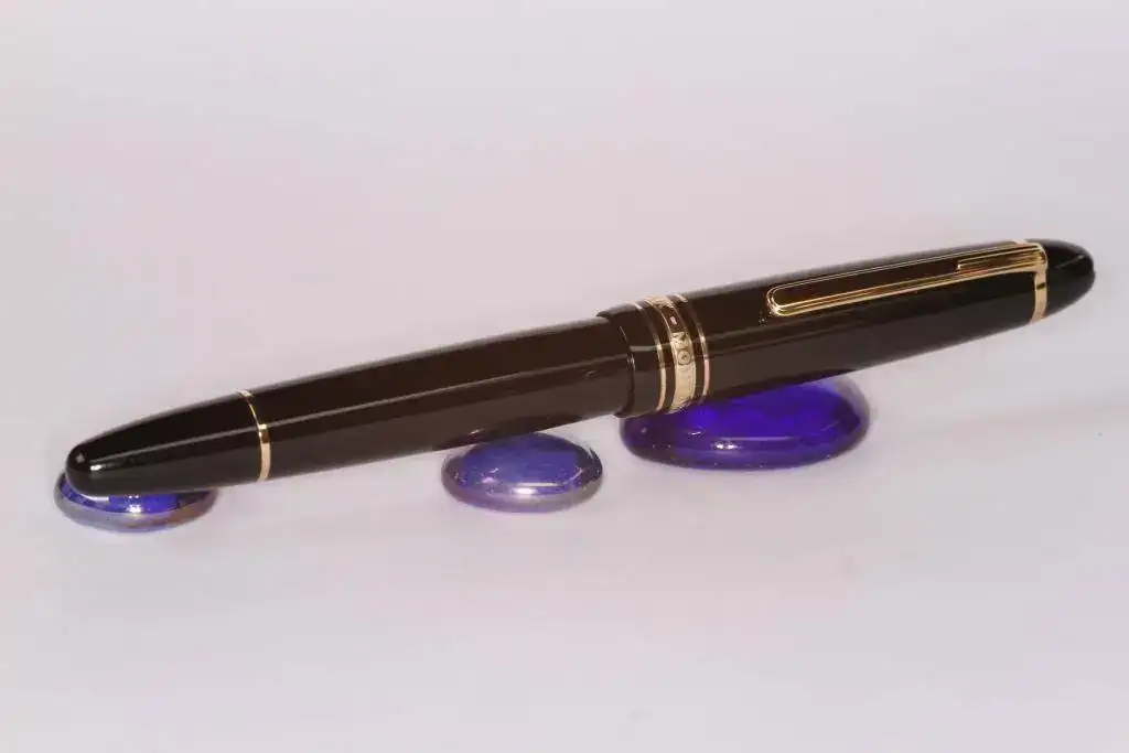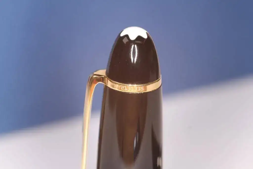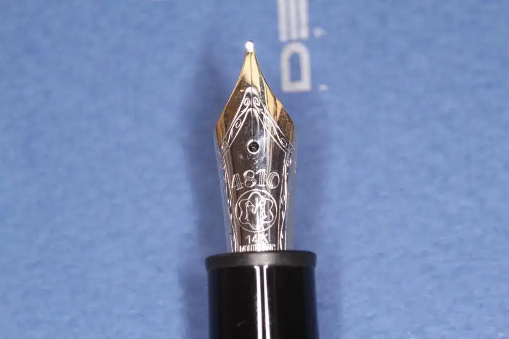 Se trata de la Montblanc 147 Traveller, que no es sino la versión para cartuchos de la 146. Funciona solo con cartuchos, que se alojan en un receptáculo que hay que desenroscar del culote de la pluma. Mide 1 mm más que la 146. Por lo demás, y con excepción del citado sistema de carga de tinta, es igual que su "hermana": capuchón a rosca, plumín de oro bicolor 14 K, punto M jugoso; número de serie grabado en el anillo del clip y la consabida estrellita blanca en el extremo del capuchón.