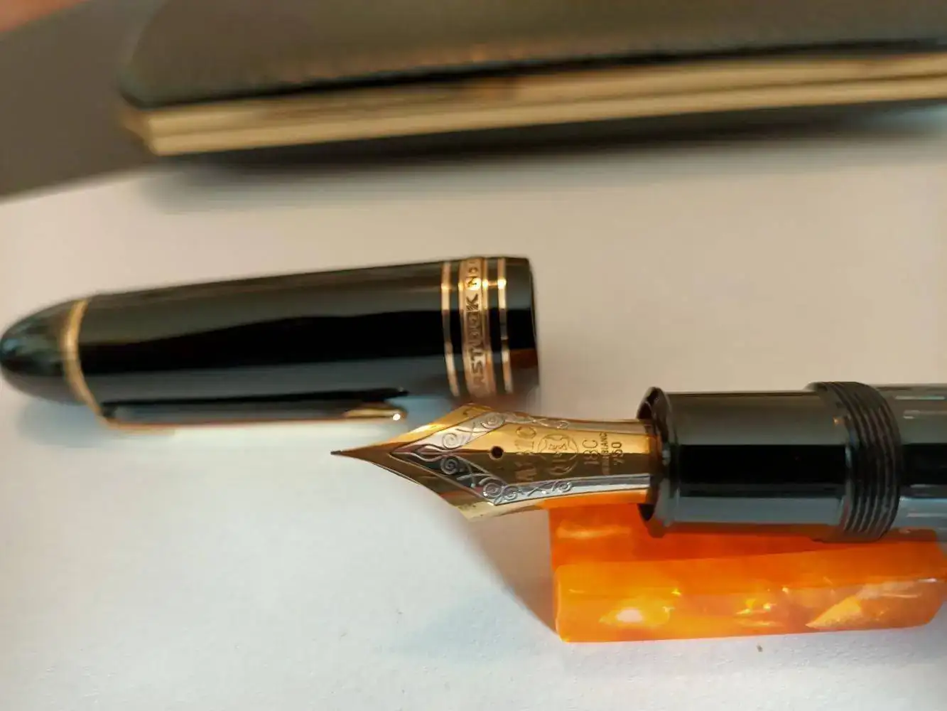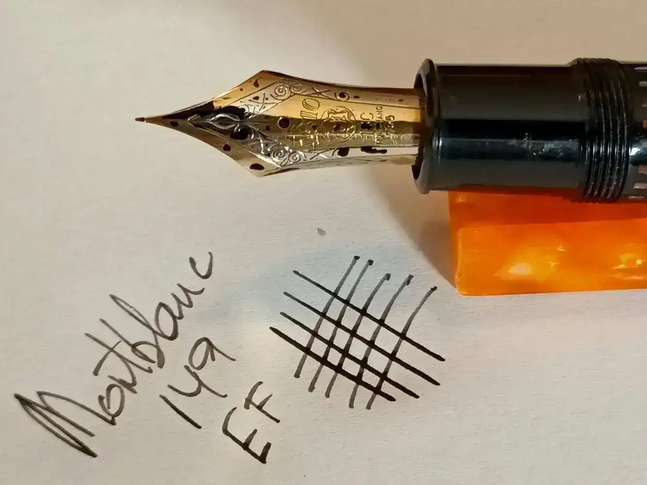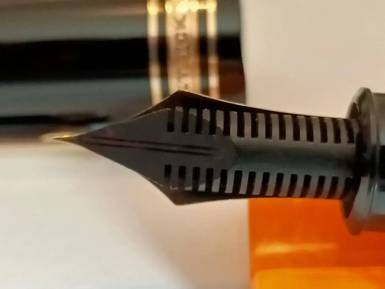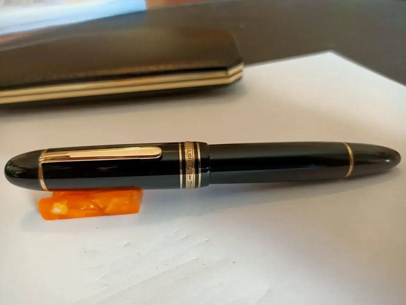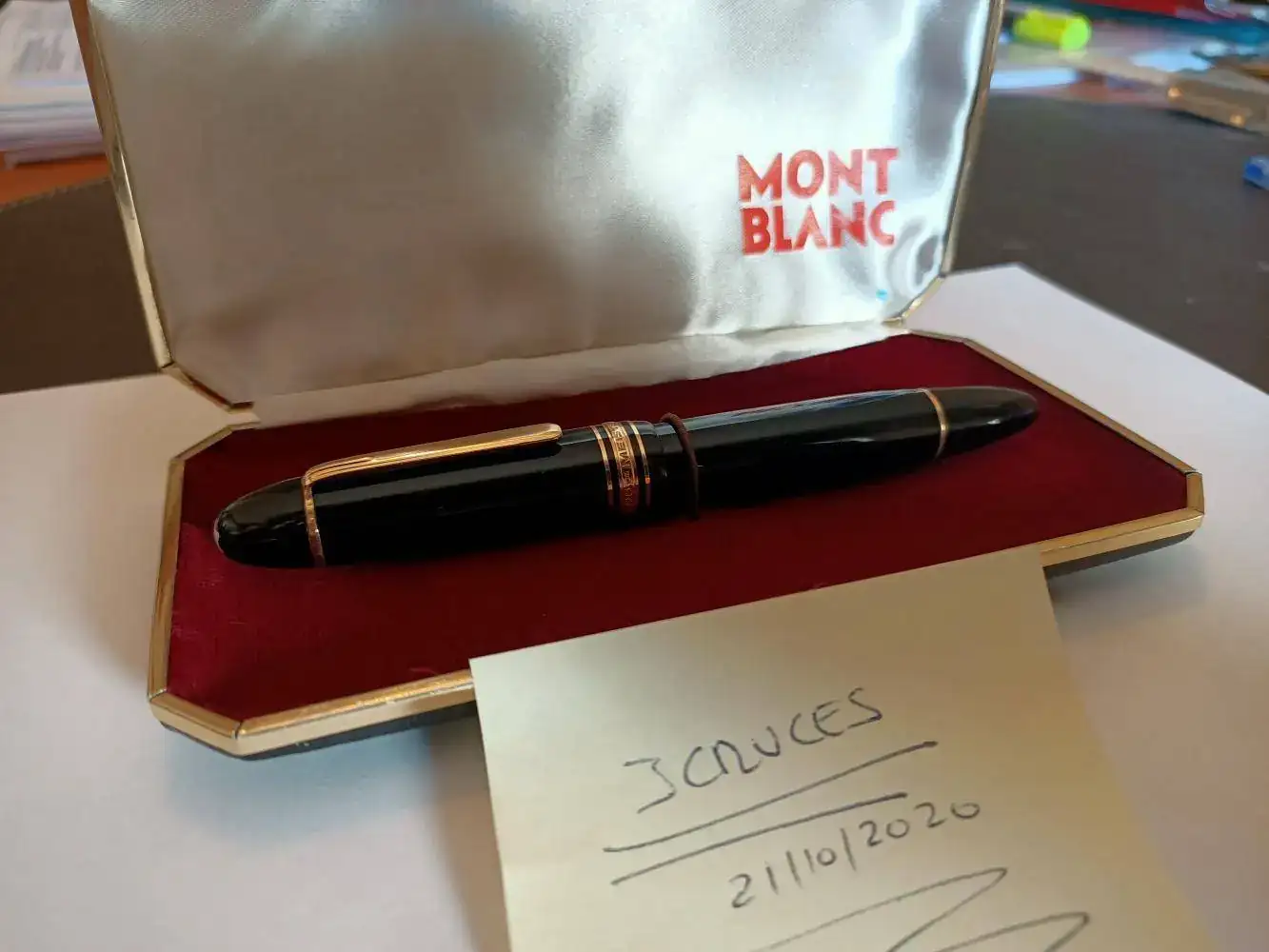 Buenos días, pongo en venta está magnífica Montblanc 149, de finales de los 80, plumín tricolor de 18c rígido y alimentador de ebonita, EF. La misma presenta un perfecto funcionamiento revisado en T&Y, donde además se le ha sellado un minúscula grita que presentaba en el labio, no se nota a simple vista, y de ahiy el precio de venta. No presenta ni falta de dorados, ni otras grietas, ni golpes, ni grabados que no sean los de la propia marca. Se acompaña de su caja original en perfecto estado.Precio puesta en casa por correo certificado facilitando el seguimiento, en 285 €Y ahora unas fotos