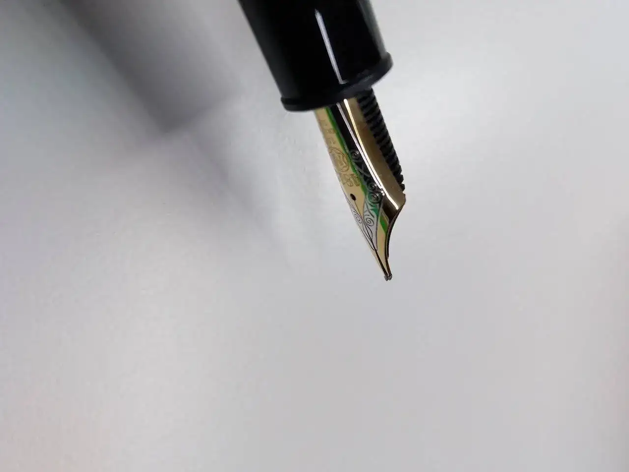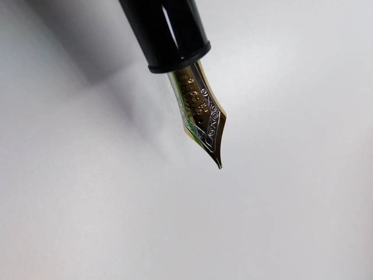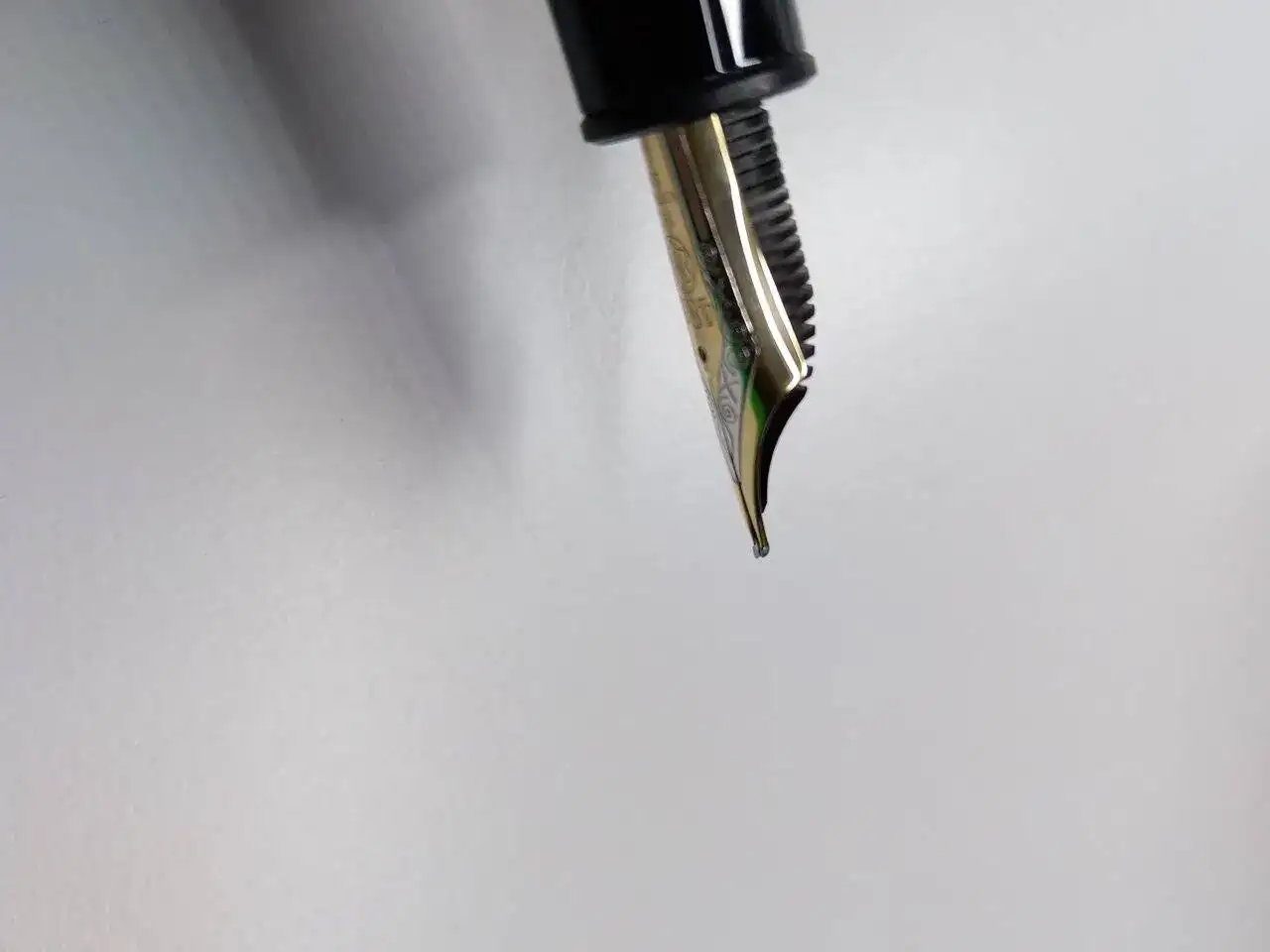 Pues bien, resulta que el plumín, precioso, está desajustado. Uno de sus patas está más elevada que la otra. Cuando la presiono se ajusta perfectamente; quiero decir que parece que es solo un problema de altura, no afecta a la horizontalidad, no está separado. (De todo adjunto fotografías, que espero os permitan apreciarlo.)