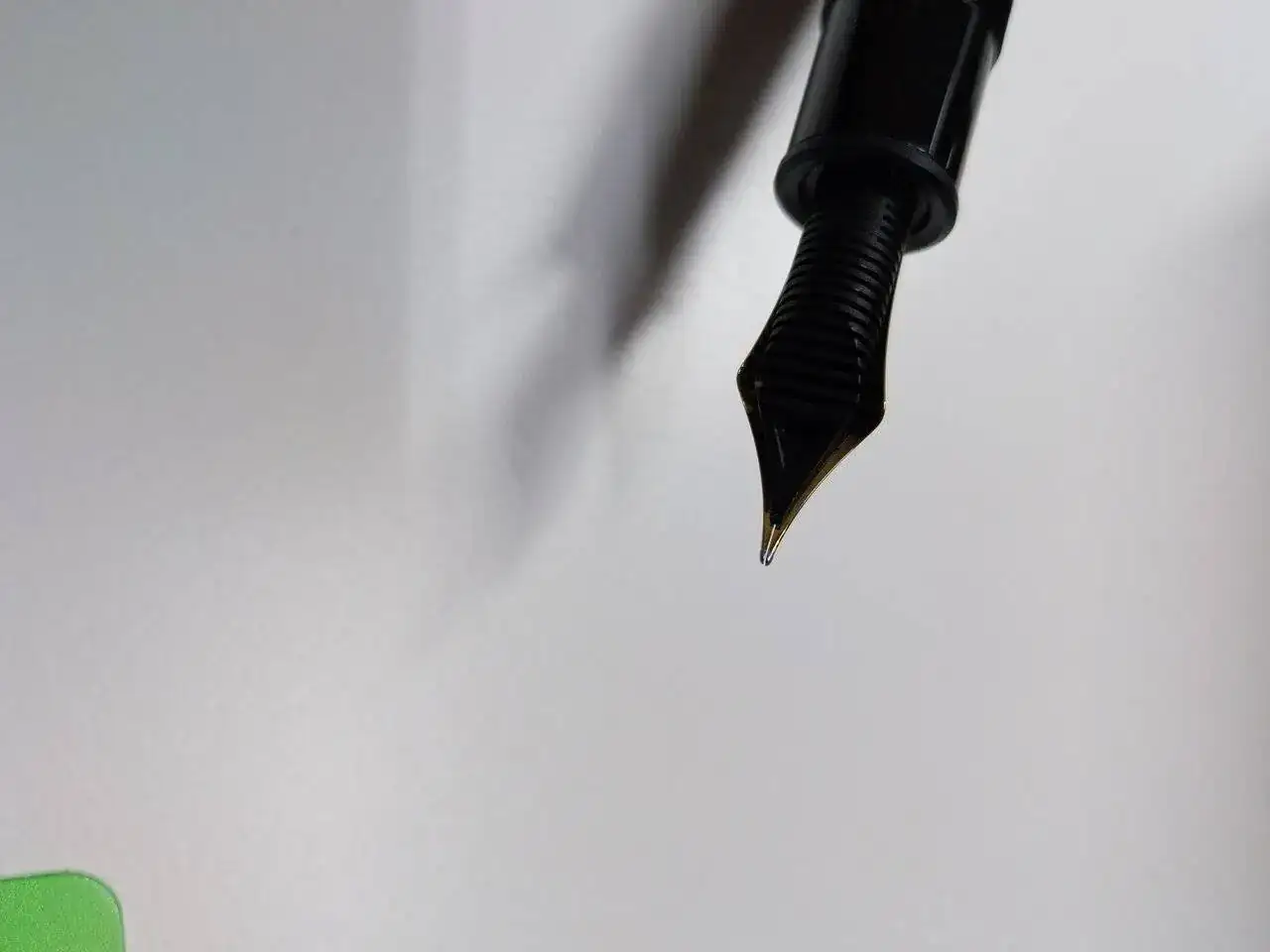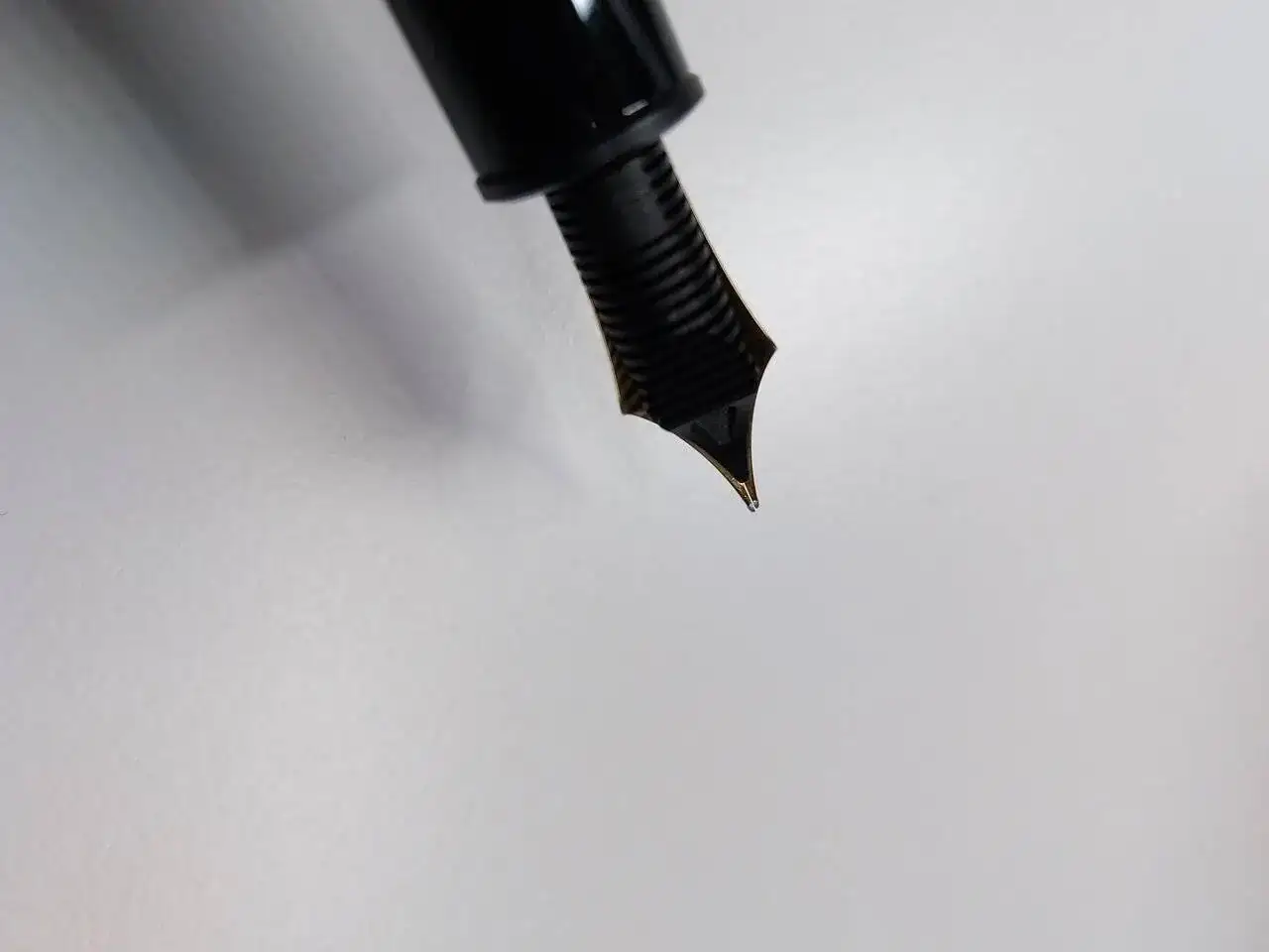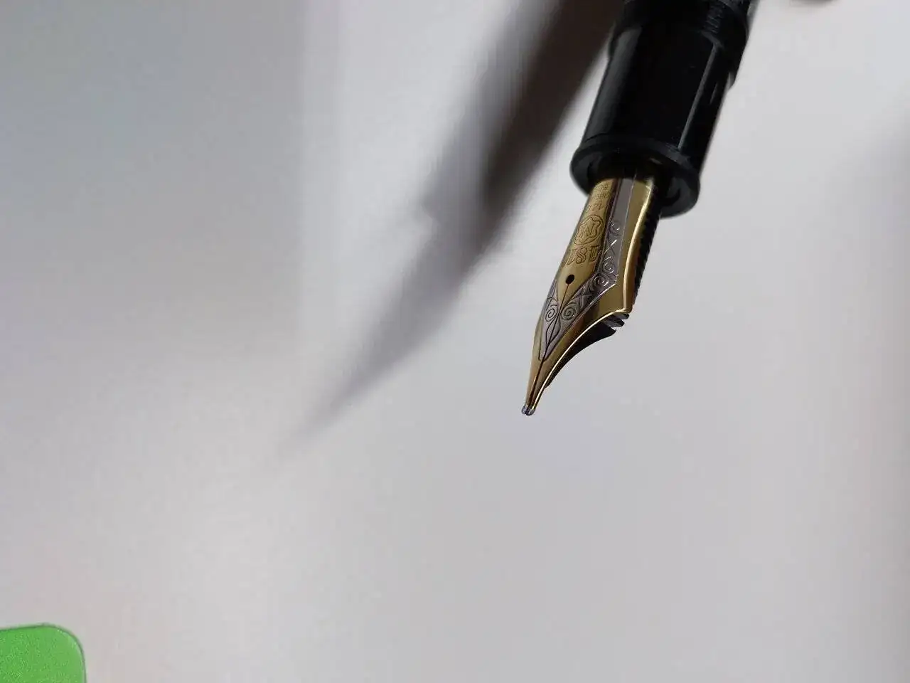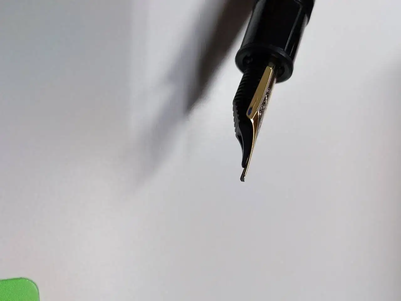 Pues bien, resulta que el plumín, precioso, está desajustado. Uno de sus patas está más elevada que la otra. Cuando la presiono se ajusta perfectamente; quiero decir que parece que es solo un problema de altura, no afecta a la horizontalidad, no está separado. (De todo adjunto fotografías, que espero os permitan apreciarlo.)