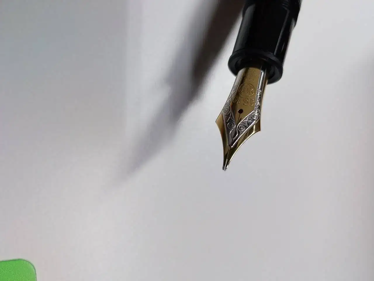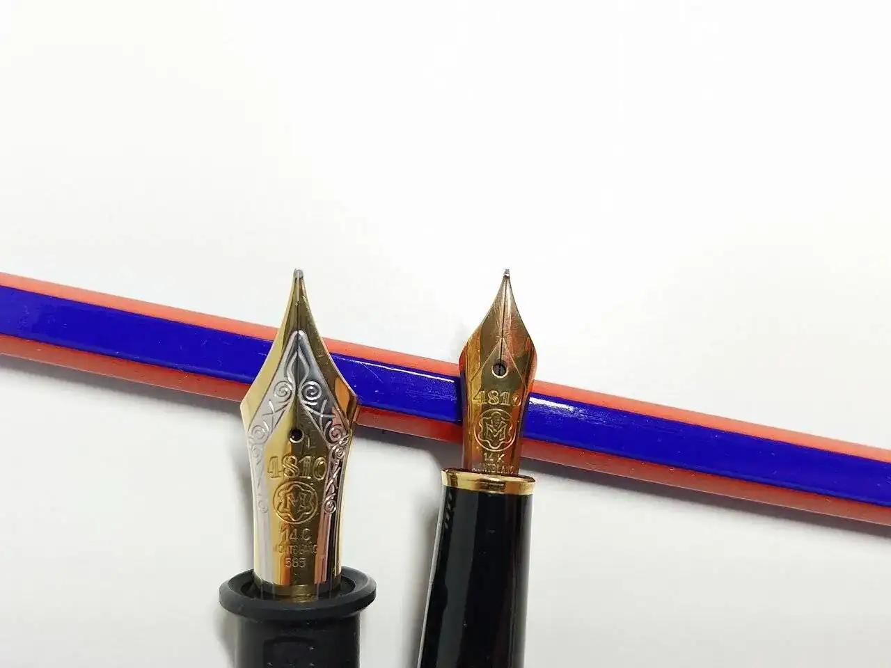 Se trata de una MontBlanc, con plumín tricolor de 14c, lo que tengo entendido la ubica en la primera época (luego fueron bicolor y, las modernas, recuperan el tricolor pero en 18K; ahora no recuerdo dónde exactamente vi esto, pero seguro que de alguno de ustedes en pasados hilos).