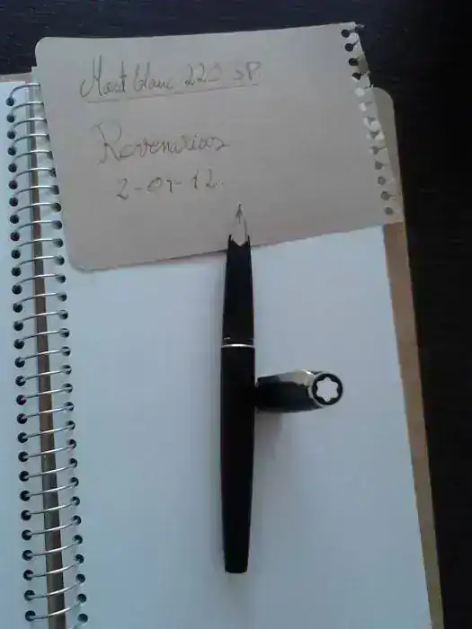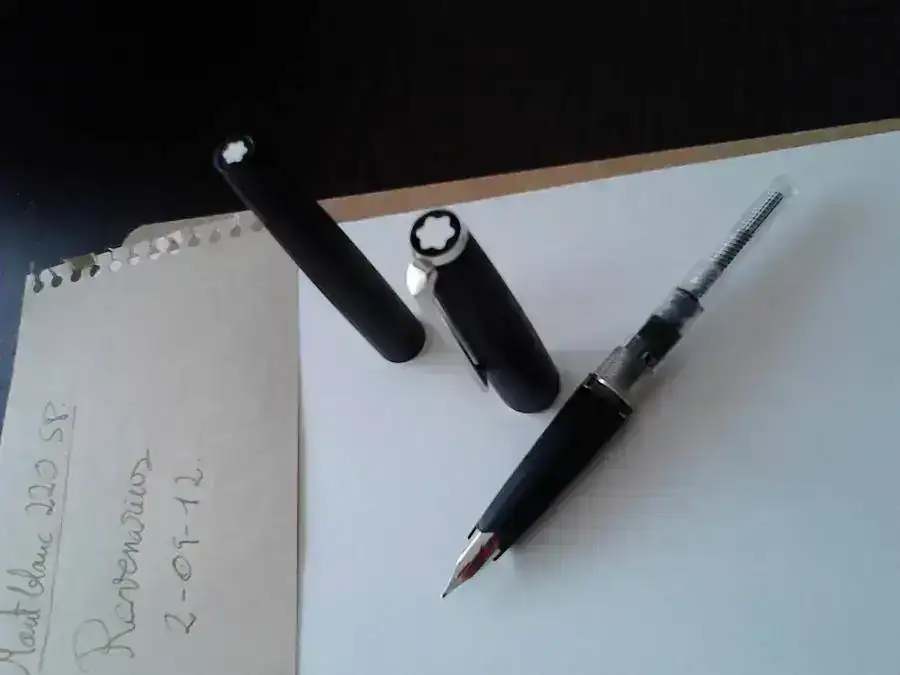 La pluma es el modelo Montblanc 220 SP, con plumín de oro de 14k, punto M con un ligero toque stub. Carga por cartuchos/convertidor, el cual no tengo el original, pero se entrega con uno genérico. No tiene marcas de ningún tipo y conserva el color negro original. No tiene ni caja ni papeles.