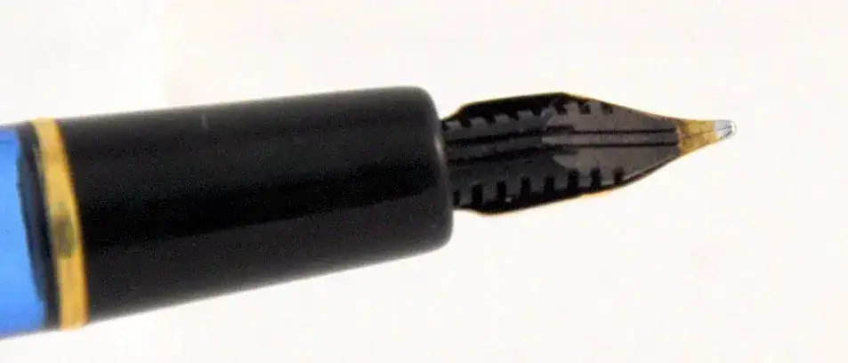 La pluma tiene grabado en el Blind Cap (final del barril y rosca de carga), la letra M, pero el Plumín ESCRIBE FINO, así lo he apreciado, un fino magnífico y suave.