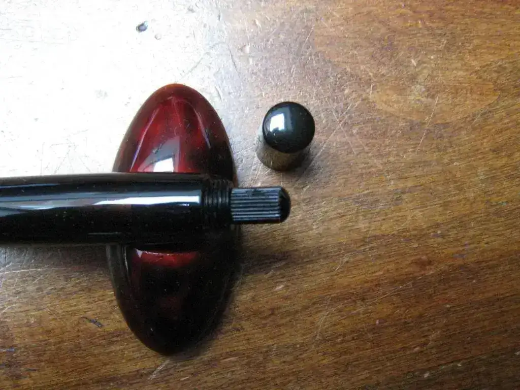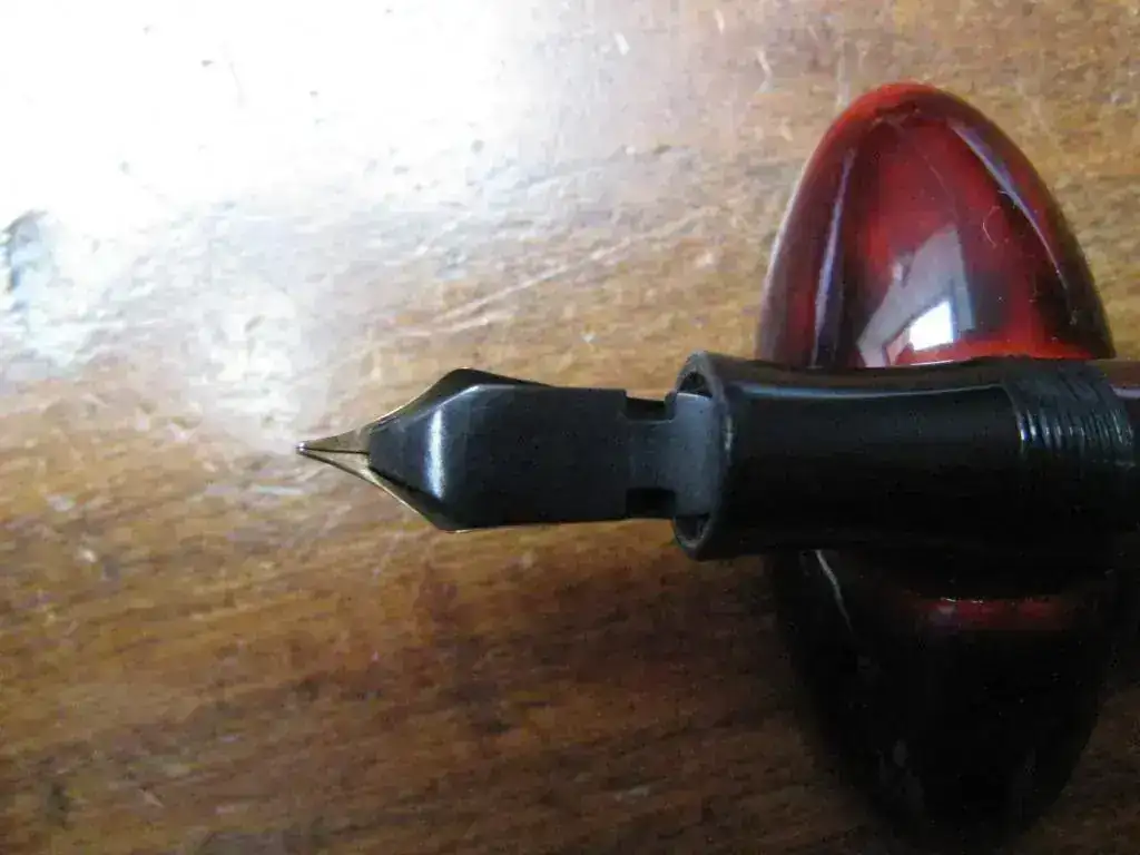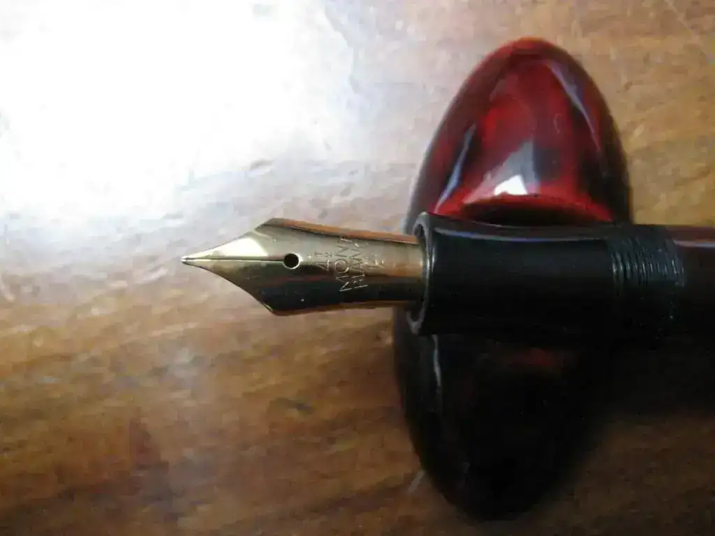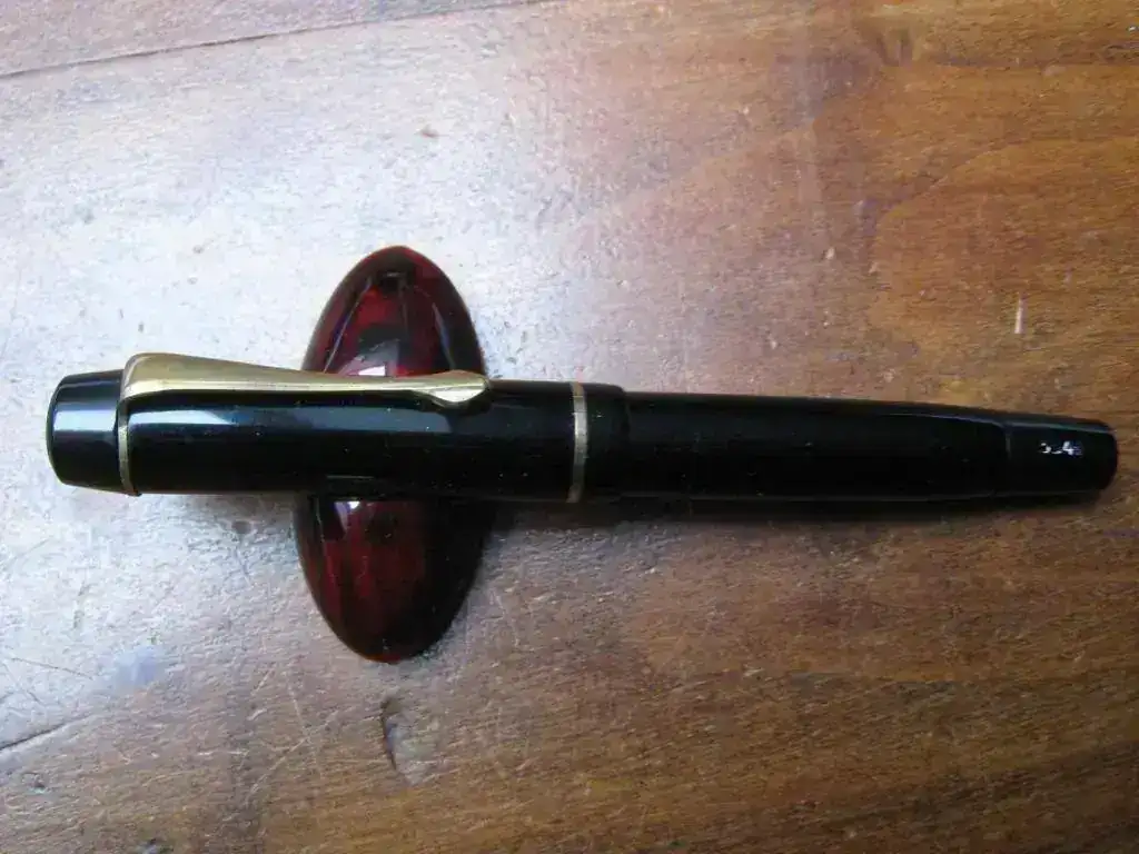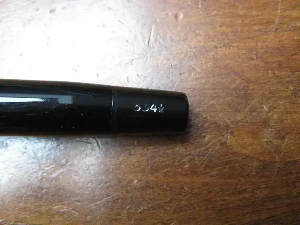 Vendo esta Montblanc 333,5 fabricada en Hamburgo entre 1937-1942. Está en un estado excelente, es de celuloide negro con adornos metálicos chapados en oro. No tiene golpes arañazos ni roturas, y monta un plumin de 14K (cosa rara porque la mayoría los llevaba de acero). El punto es un M de Montblanc. Carga por medio de émbolo, y como se puede ver conserva perfectamente los logos de la marca.