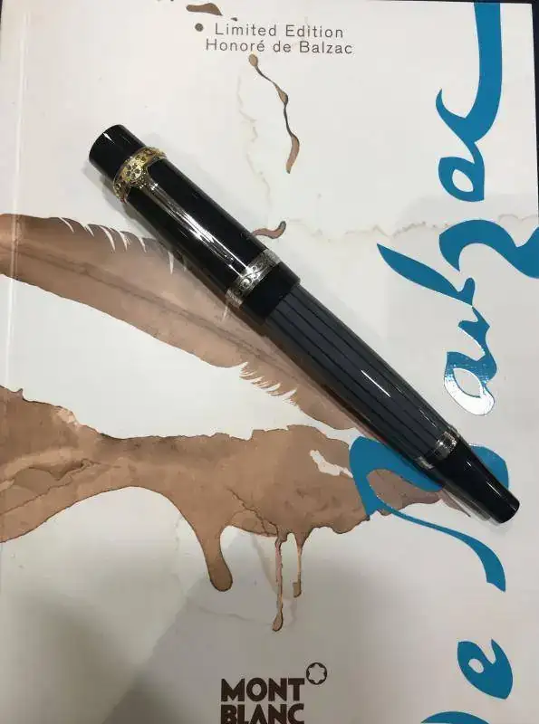 La Edición de Escritores 2013 es un tributo al novelista y dramaturgo francés que aportó una obra de casi 100 novelas cortas a la literatura universal del siglo XIX: Honoré de Balzac. Inspirando en el "Dandismo" del siglo XIX y en la elegancia de Balzac, el depósito de resina preciosa negra y laca gris, realzado con un grabado, evoca el característico chaqué que tanto gustaba a los refinados caballeros parisinos. Las grandes dimensiones del artículo de escritura representan la imponente presencia de Balzac y el clip decorado con una turquesa en el extremo simboliza el bastón del autor. Los anillos platinados y dorados evocan la estructura de clases de la sociedad francesa de comienzos del siglo XIX, uno de los temas principales de la obra de Balzac.