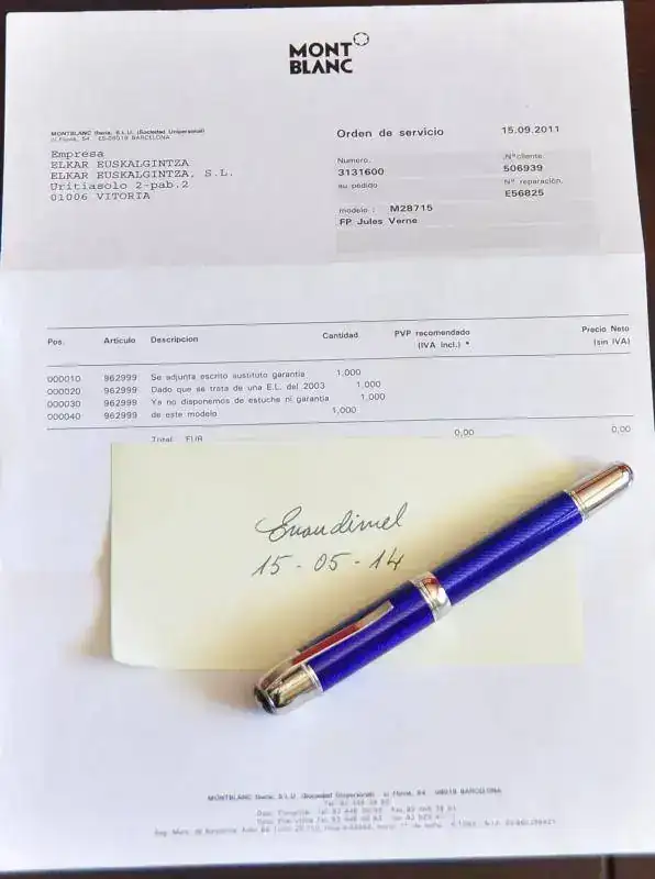 La pluma solo traía el estuche, porque la caja de cartón exterior y el libro de la garantía lo extraviaron en la tienda. A petición de otro cliente que estuvo interesado unos meses antes en la pluma y que finalmente no llegó a comprarla, el establecimiento mandó la pluma a Alemania para que emitieran un certificado de autenticidad, que es el que aparece en las fotos. Como la pluma está en garantía, además del certificado de autenticidad también adjuntaré el ticket de compra donde aparece la fecha de adquisición para que sirva como garantía por sí hubiese algún problema.