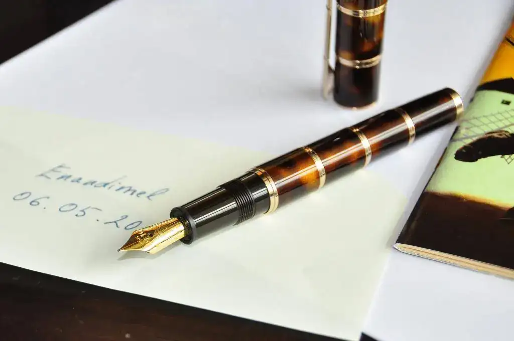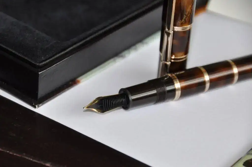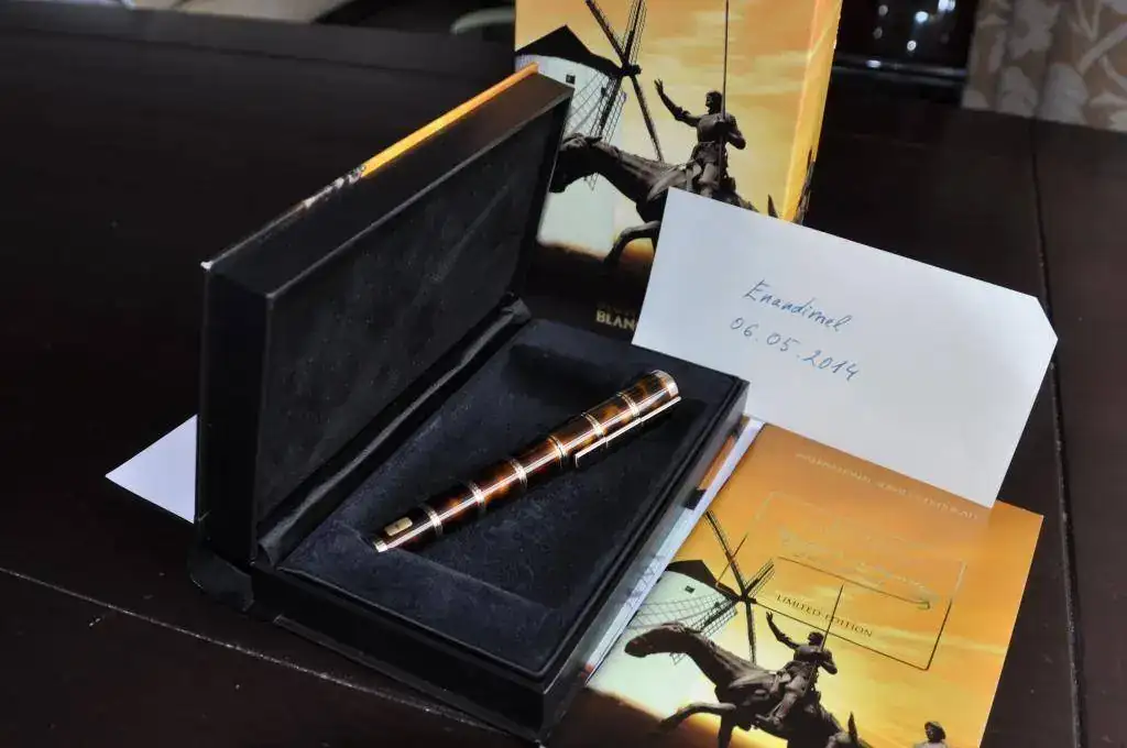 El cuerpo brilla por la laca marrón con efecto mármol y tiene la firma del escritor. El plumín, de oro de 18 quilates y tallado a mano, lleva grabado un molino de viento, que por ignorancia germana no reproduce los molinos autóctonos de la Mancha, sino uno holandés.