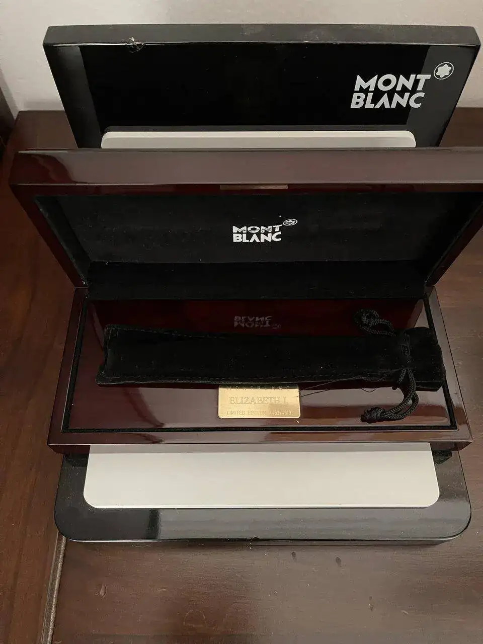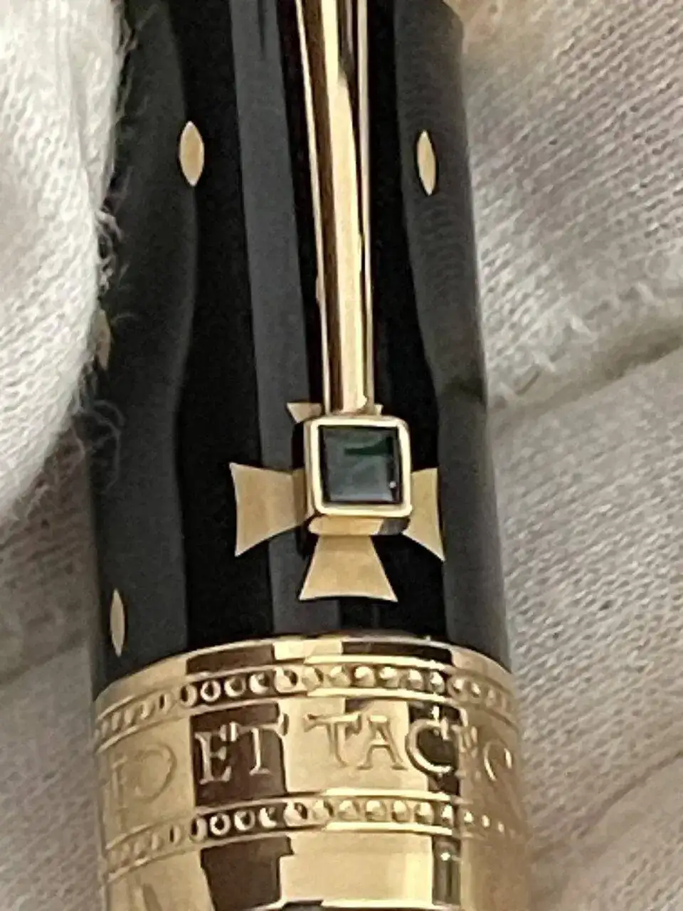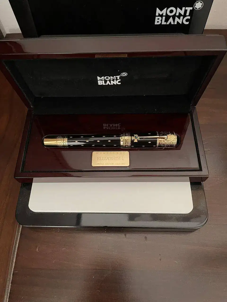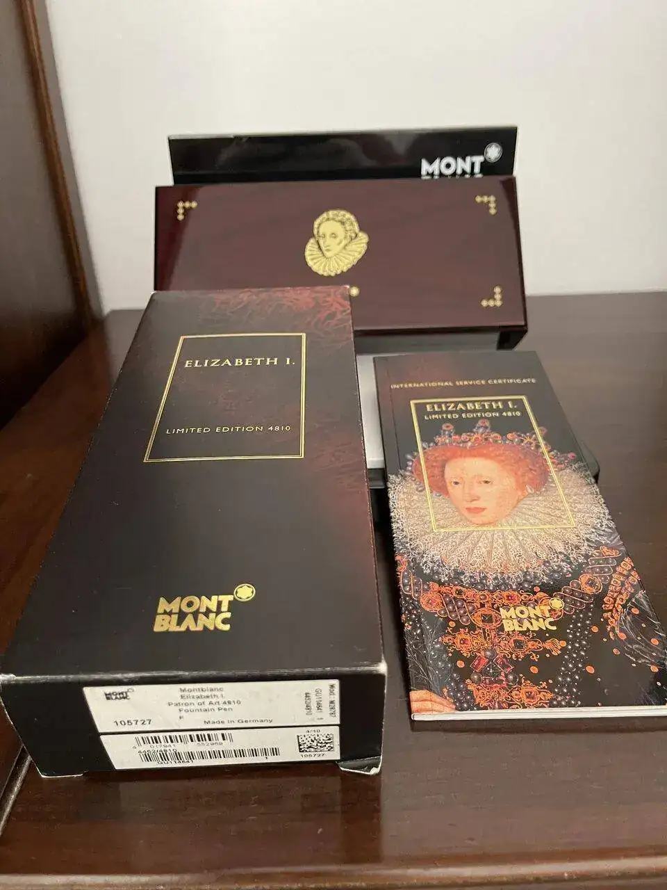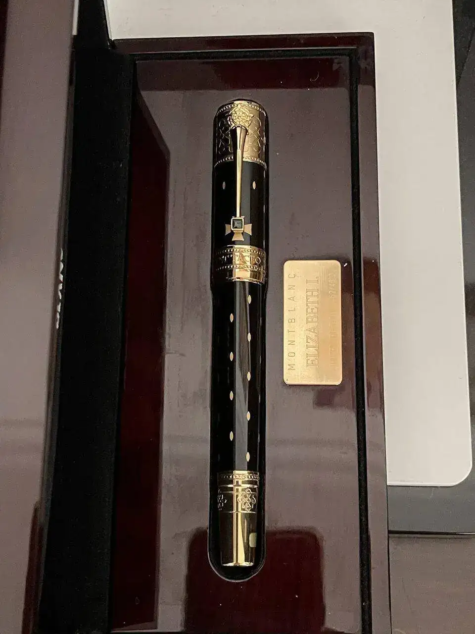 Pongo a la venta Pluma Montblanc, Patrono de las Artes Queen Elisabeth I, Edición Limitada 4810, fabricada en plata con plaque de oro, clip y plumin F de oro de 18 K, Cuerpo y capuchón de resina preciosa negra con incrustaciones bañadas en oro, granate color verde, carga con pistón, sobre caja, caja de madera y documentación, ES NUEVA SIN USO, precio 3.100 € incluidos gastos de envío.