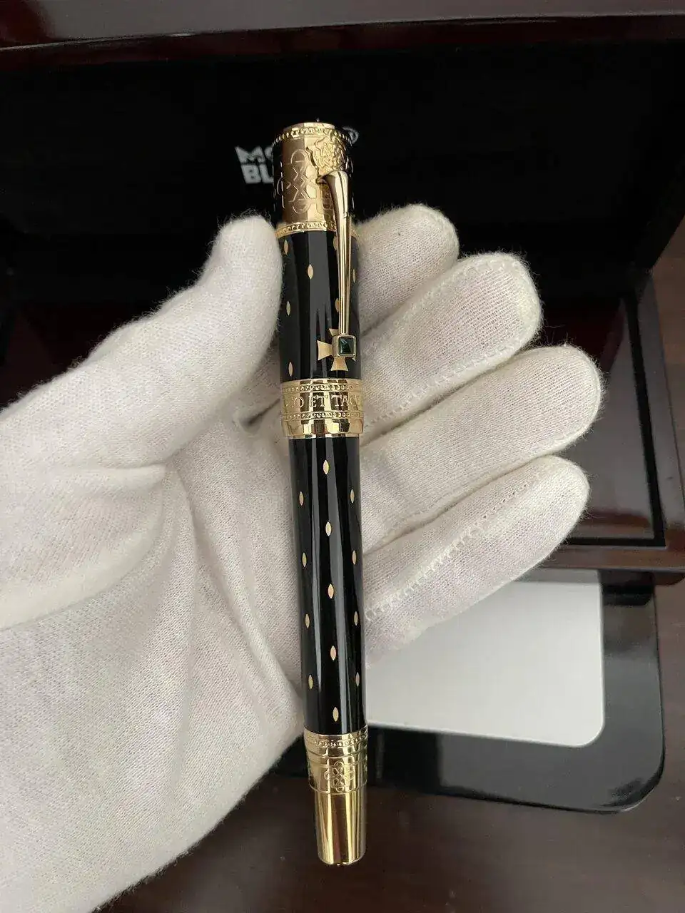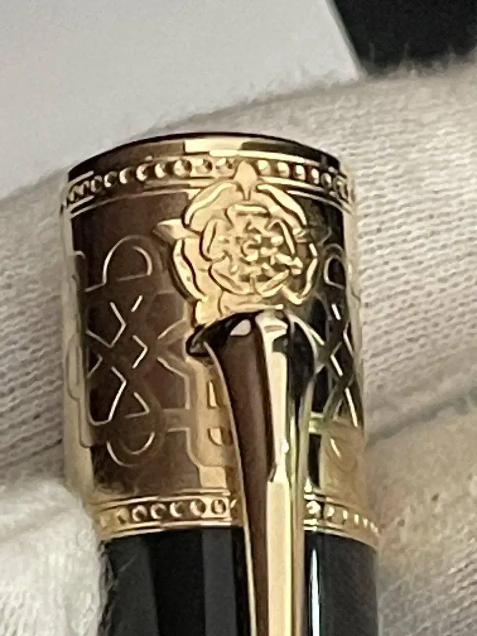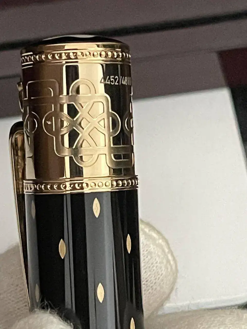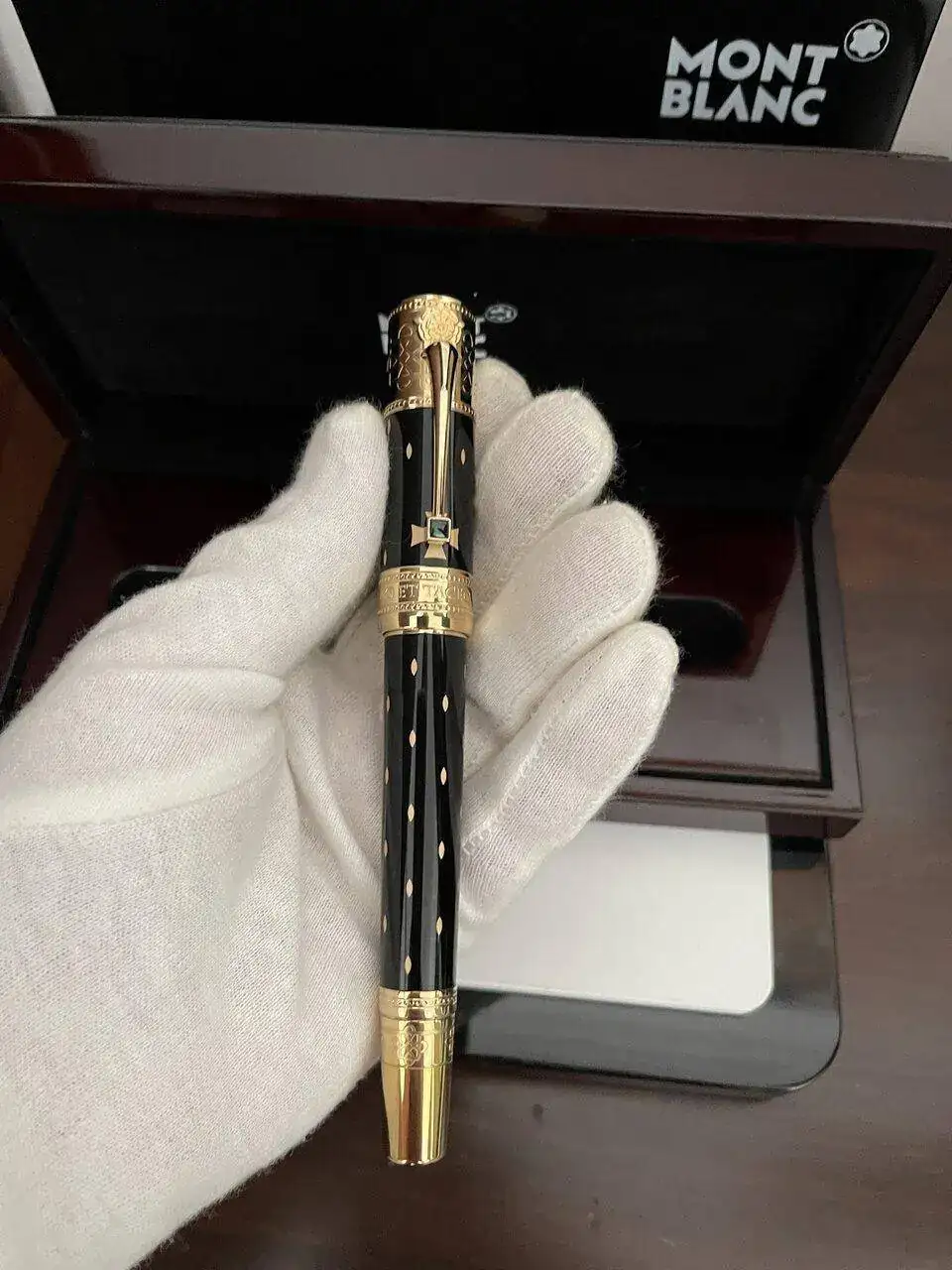 Pongo a la venta Pluma Montblanc, Patrono de las Artes Queen Elisabeth I, Edición Limitada 4810, fabricada en plata con plaque de oro, clip y plumin F de oro de 18 K, Cuerpo y capuchón de resina preciosa negra con incrustaciones bañadas en oro, granate color verde, carga con pistón, sobre caja, caja de madera y documentación, ES NUEVA SIN USO, precio 3.100 € incluidos gastos de envío.