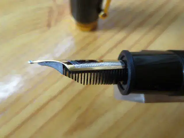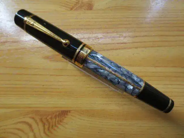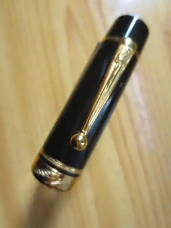 Pesa 35.5 gr, tiene un plumín espectacular con la flor de Lys, es un punto medio, de émbolo de carga "infinita". Entintada para comprobar que funciona perfectamente, está impoluta. La resina "crackeada" es espectacular, los detalles, en oro, de la espada en el clip o de las plumas en el anillo del capuchón son detalles a destacar.