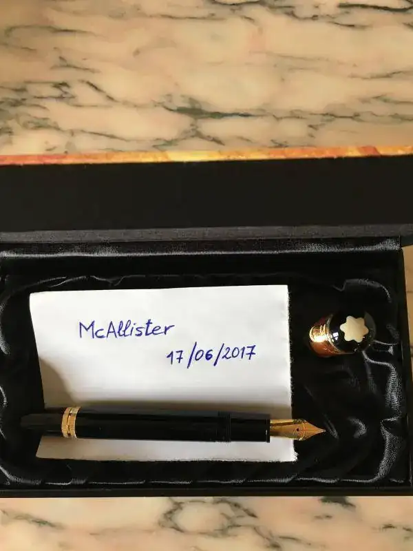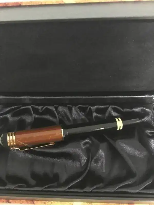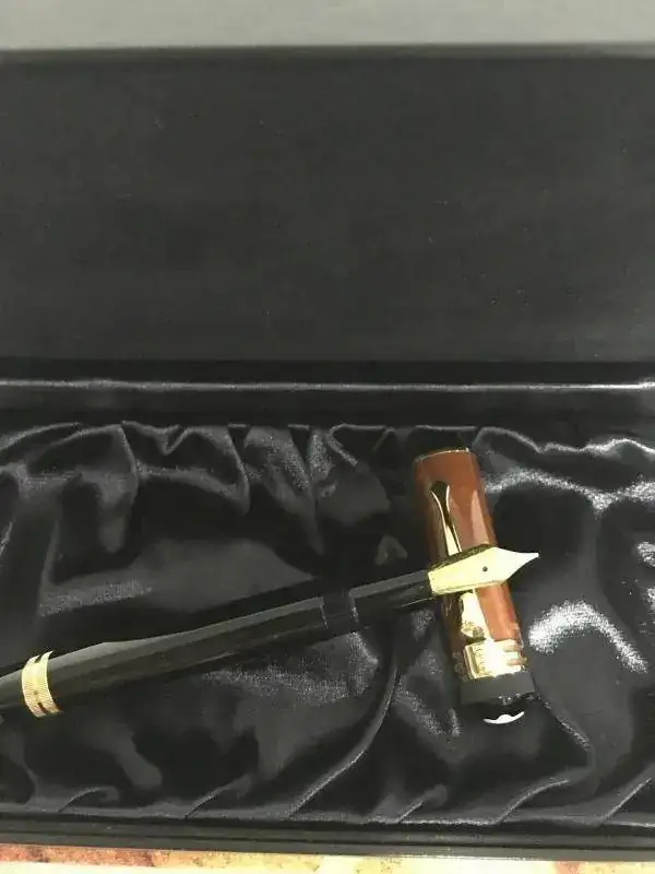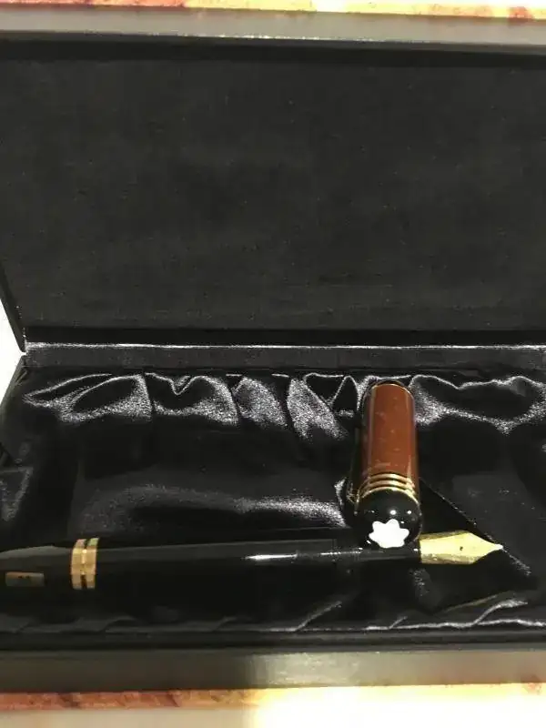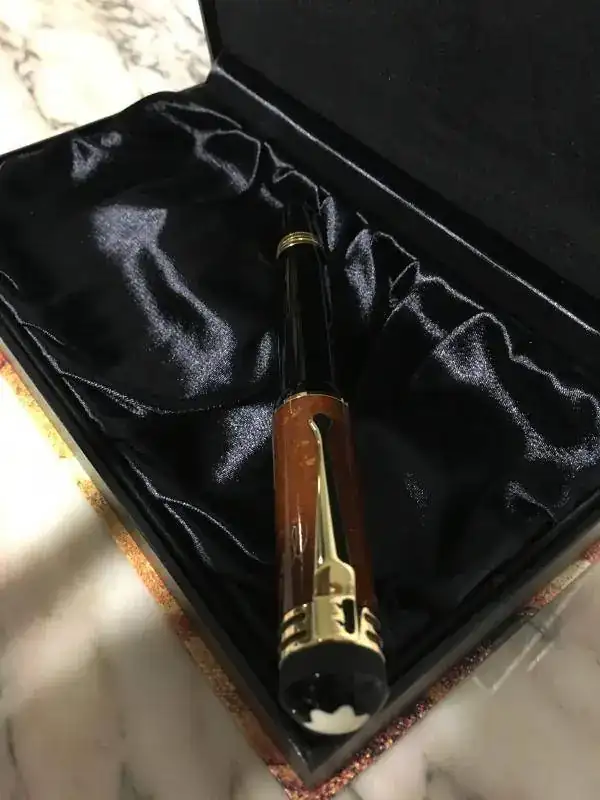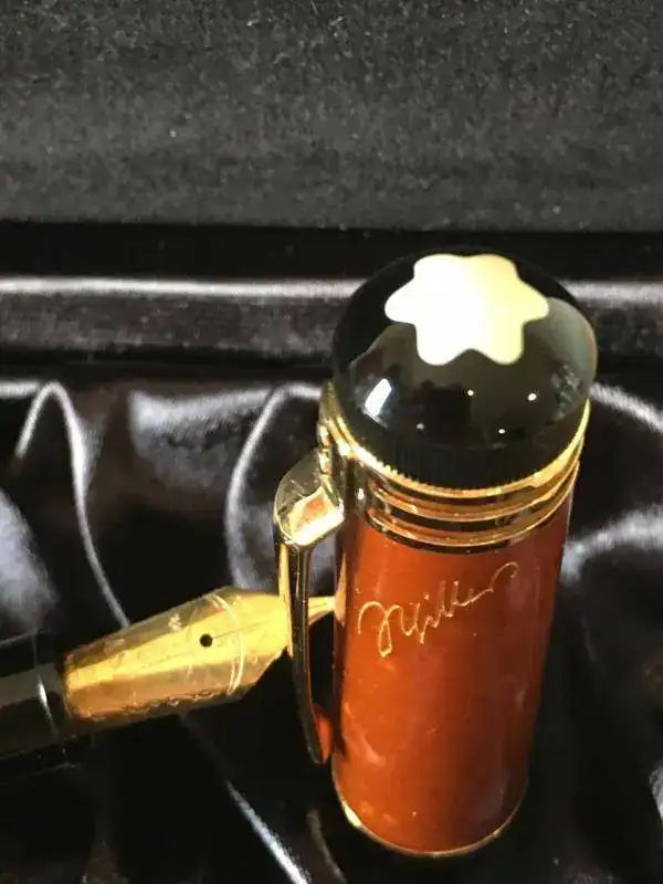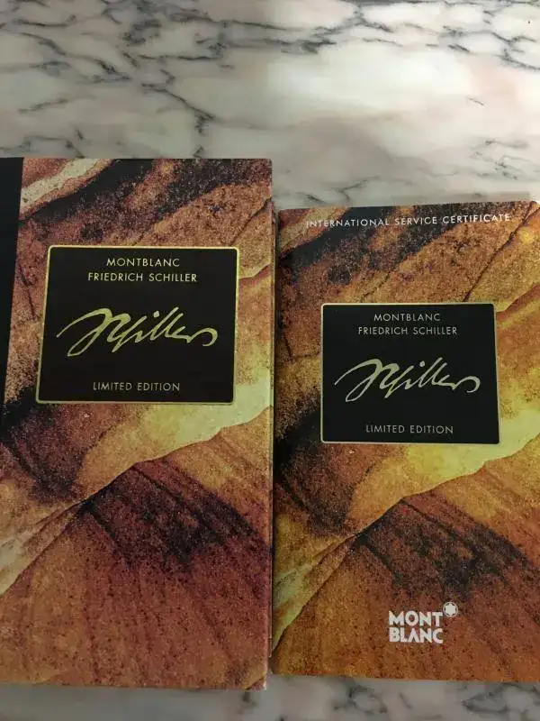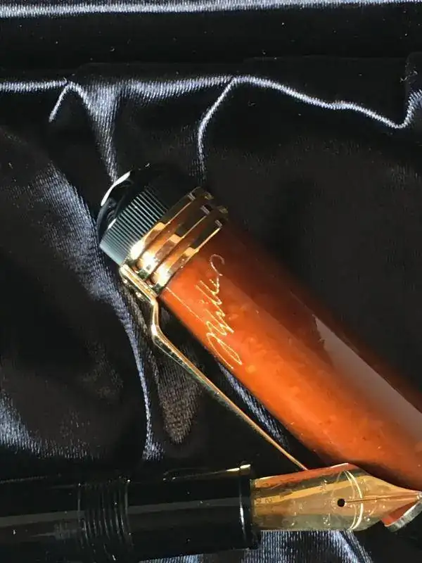 Excelentes acabados, cuerpo de resina y capuchón de ámbar.Plumín de oro 18K con grabado de una ballesta (hace referencia a “Guillermo Tell”, el personaje más conocido de la obra de Schiller), trazo F.