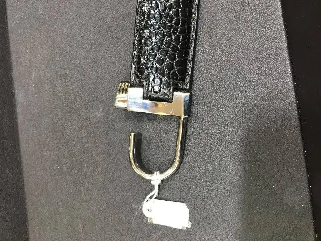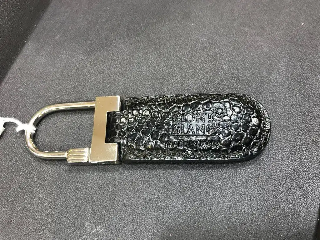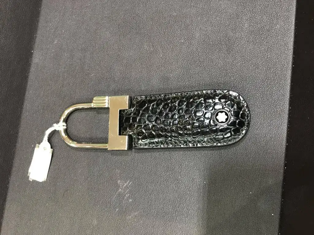 Llavero nuevo en piel de vaca grabado, con emblema en una cara y cierre de acero.