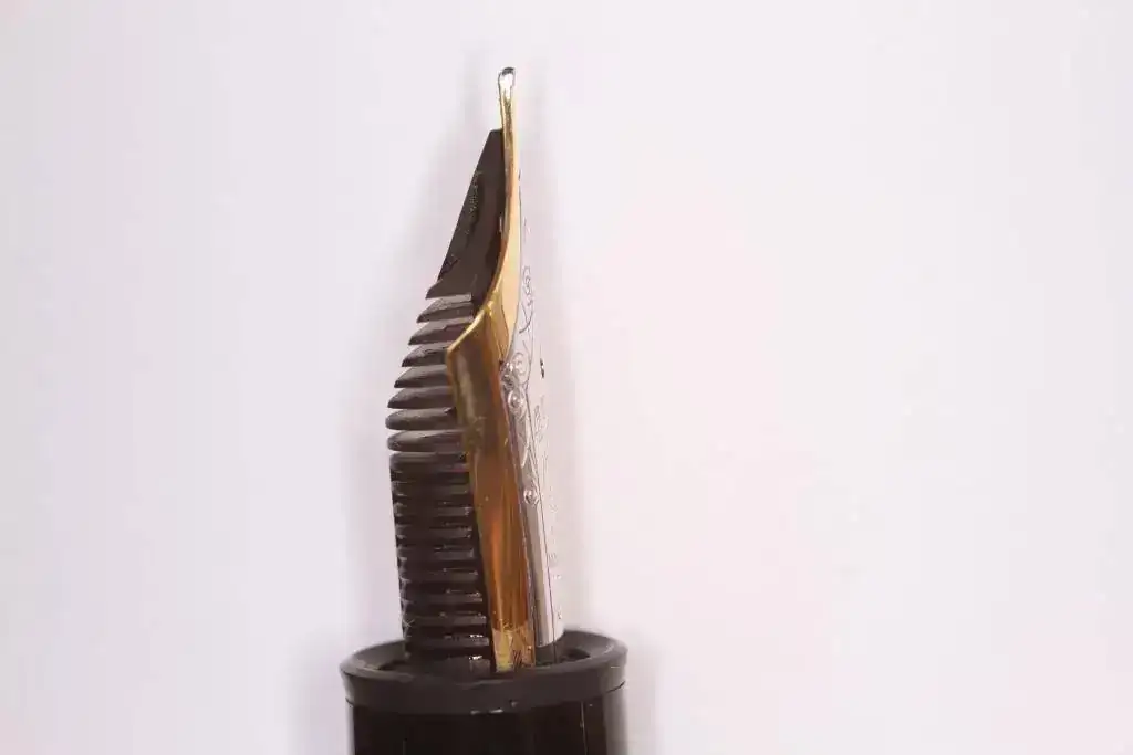 El plumín bicolor de oro de 18 k escribe con un punto F aceptablemente generoso, como puede apreciarse en la prueba de escritura de una de las fotos, realizada sobre papel Oxford Optik con tinta Rohrer & Lingner. Precisamente el motivo de ponerla en venta es el punto, porque cuando la adquirí era aficionado a puntos finos, pero ahora prefiero trazos bastante más gruesos.